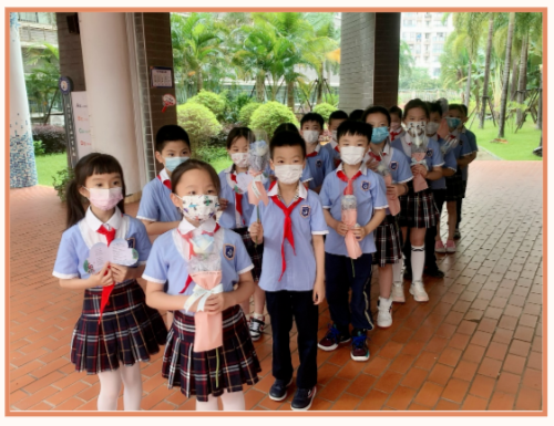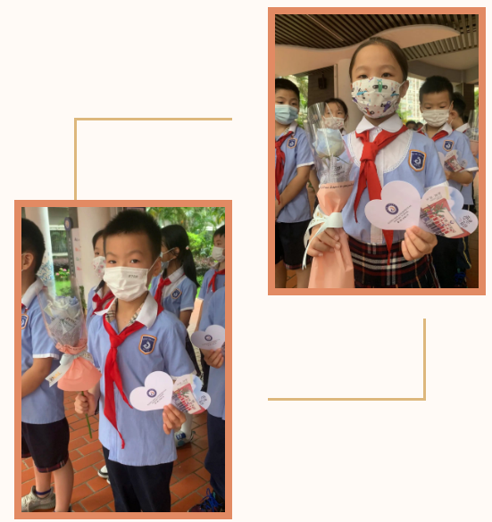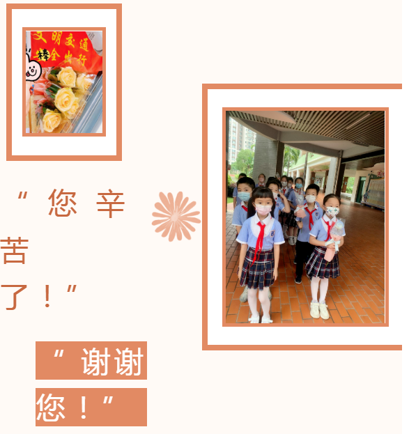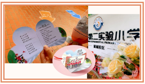 为此,学校特别用心地为六年级的家长们定制了一张精美的感恩卡,并在每个班级最后一天值岗的当天发给全班的孩子,让孩子们带着这份小小的心意、大大的感谢回家。不仅如此,学校还特别安排了二年级孩子们来参与感恩小环节,为执最后一班岗的六年级爱心家长们送上代表心意的鲜花与感恩卡。