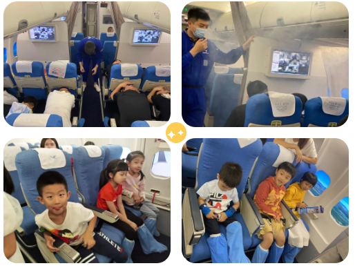 到了模拟舱,讲解员为小朋友们讲解了机舱的外形和机内的构造,大家在工作人员的带领下兴致勃勃地参观了机舱内部:整个舱室内部完全按照真实民用客机设计,包括里面的座椅、行李架、多媒体设备、救生装置……孩子们和飞机来了一次亲密的接触,仿佛身临其境,他们兴奋极了,有些小朋友在不停地问:“老师!飞机什么时候起飞啊?”浑然忘记这是模拟舱。