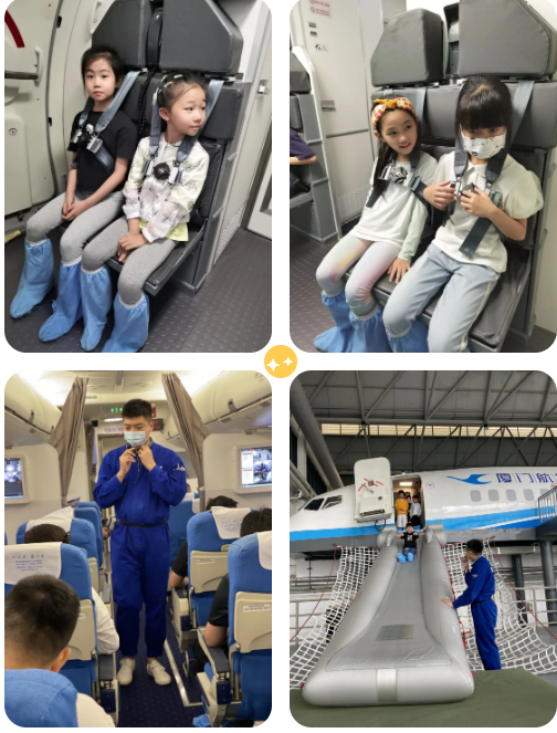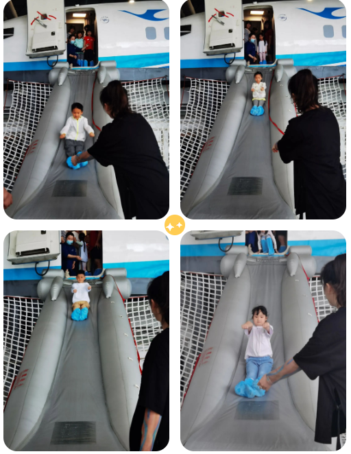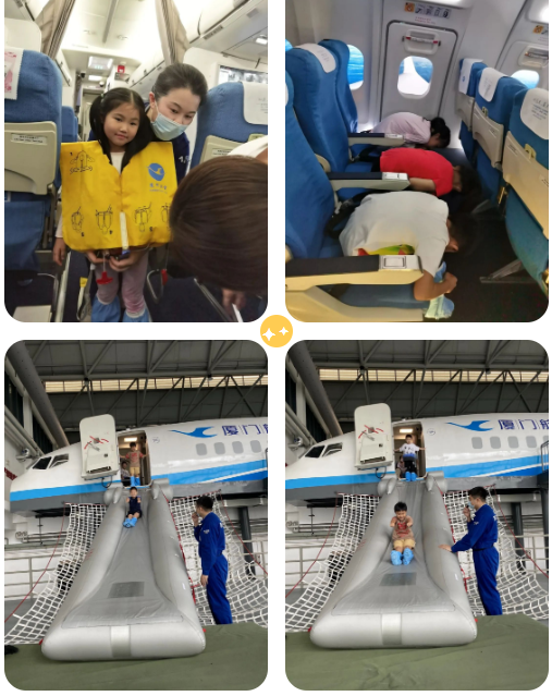 参观活动的最后一项内容是学习紧急情况下撤离的方法、发动机起火冒烟出现突发事故时救生衣的使用方法,以及紧急迫降时候防冲撞的姿势。讲解员一边讲解一边做示范,大家都跃跃欲试,最后,大家排队体验了跳滑梯,去印证讲解员叔叔的教学方法。