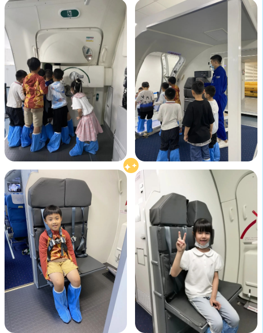 讲解员给大家演示了开关舱门,并带领小朋友们体验乘务员座椅,小朋友们兴奋不已,纷纷积极踊跃地提问。