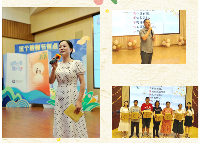 表彰活动的最后,吴副校长和李副校长用暖心的诗词和话语,传递双份的祝福,陈校长为教师节庆祝活动前的暖场游戏中博得状元的老师们送上礼物。