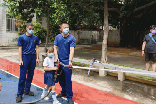 紧接着,消防员叔叔现场演示了消防水枪不同的喷水功能,引发了孩子们极大的兴趣。在消防叔叔的带领下,同学们现场体验了消防水枪的灭火功能,他们用稚嫩的小手撑起了消防水枪,瞄准目标灭火.