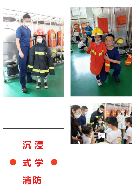 消防车后面是一排消防服,消防服也大有讲究。应对不同的救援情况,消防服也不一样。救火时消防员穿戴的一套装备重达60斤。同学们还体验了穿戴灭火战斗服活动。他们穿上消防服,戴上消防帽,化身小小消防员,稚嫩的脸上洋溢着自豪与骄傲,也感受到了消防战士的艰辛.