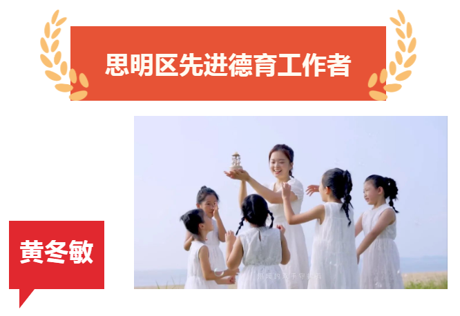 黄冬敏,中共党员,厦门市骨干教师,厦门市中小学业绩突出班主任,思明区优秀少先队辅导员。曾获厦门市中小学班主任专业能力大赛之教育故事比赛三等奖,厦门市青年教师教学基本功比赛一等奖和多个单项奖。她视每位孩子为创造奇迹的小魔法师;弯下腰来耐心倾听孩子的心声;提供广阔的舞台尽情发挥孩子的才干。所带班级被全国少工委评为“动感中队”,并获思明区“快乐中队”和“先进班级”等荣誉称号。