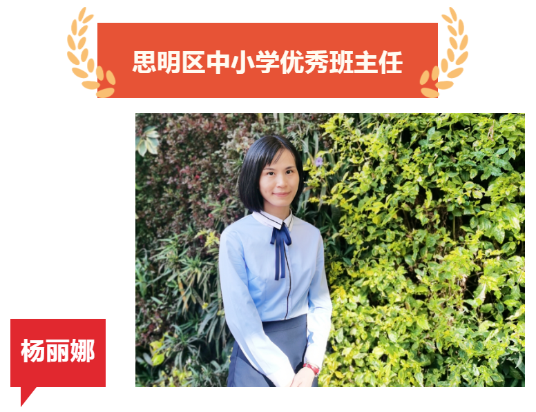 杨丽娜,中共党员,工作认真负责,阳光热情。先后获厦门市骨干教师、思明区优秀班主任、思明区骨干教师、思明区优秀中队辅导员、思明区品德学科青年教学能手等荣誉称号。曾获思明区创新赛三等奖,有着较强的组织教研能力。她先后参与多项课题研究梳理工作,其中省级课题1项,市级课题1项,区级课题1项,均为核心参与成员。