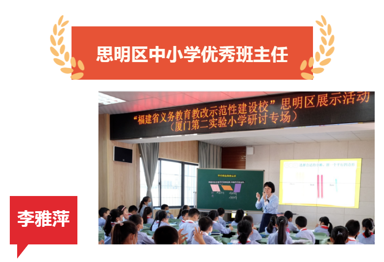 李雅萍,中共党员,教学基本功扎实,教育理念先进,课堂教学深受广大师生好评。曾获得思明区教育系统优秀教师、优秀班主任荣誉称号,先后获厦门市第六届基础教育课堂教学改革创新大赛小学数学学科三等奖、厦门市小学试卷命制比赛二等奖、思明区小学数学优质课二等奖等。她始终坚信:越努力,越幸运!努力做实工作与生活中的每一个平凡细节,努力成为爱学生、学生也爱的教师!