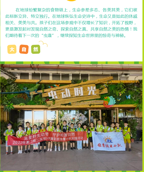 为了让孩子们更加直观地了解野生动物的相关知识,将保护动物的理论和实践相结合,9月24和25日,厦门第二实验小学展城校区2020级5班童彩班的孩子们踏着金秋的暖阳,怀揣着期待的心,整装待发,准备赴一场和虫虫的约会。