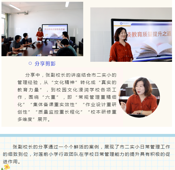 首先由市二实小的张彩虹副校长为莲前小学的管理团队带来了名为《漫谈教育质量提升之道》的经验分享。