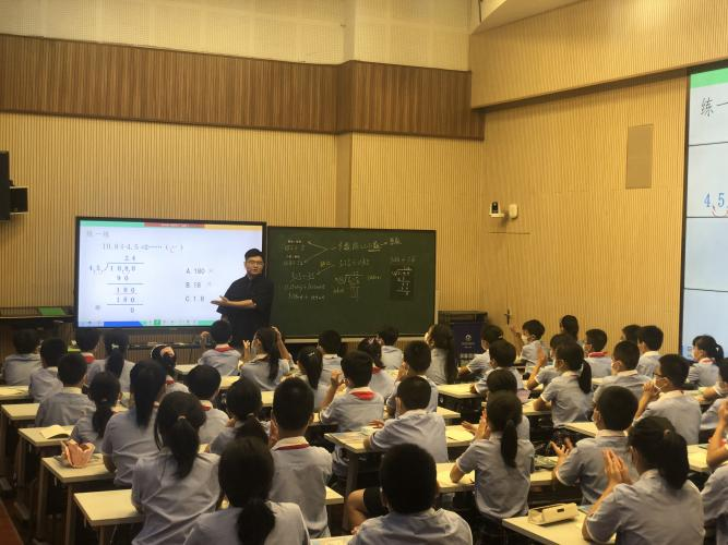接下来是两节关联的研讨课。第一节由我校吴国铎老师带来的五年级的《一个数除以小数》。国铎老师先是唤醒学生关于计数单位的知识,为建立除法算理的一致性打好伏笔,再由学生熟悉的情境入手,引导学生经历“算理冲突—探究转化—比较说理—深化算理”的过程。学生通过不断比较和分析,感悟到小数除法与整数除法算理的内在一致性——细分计数单位,并在国铎老师的引导下,通过错例辨析,自主概括出一个数除以小数的算法。