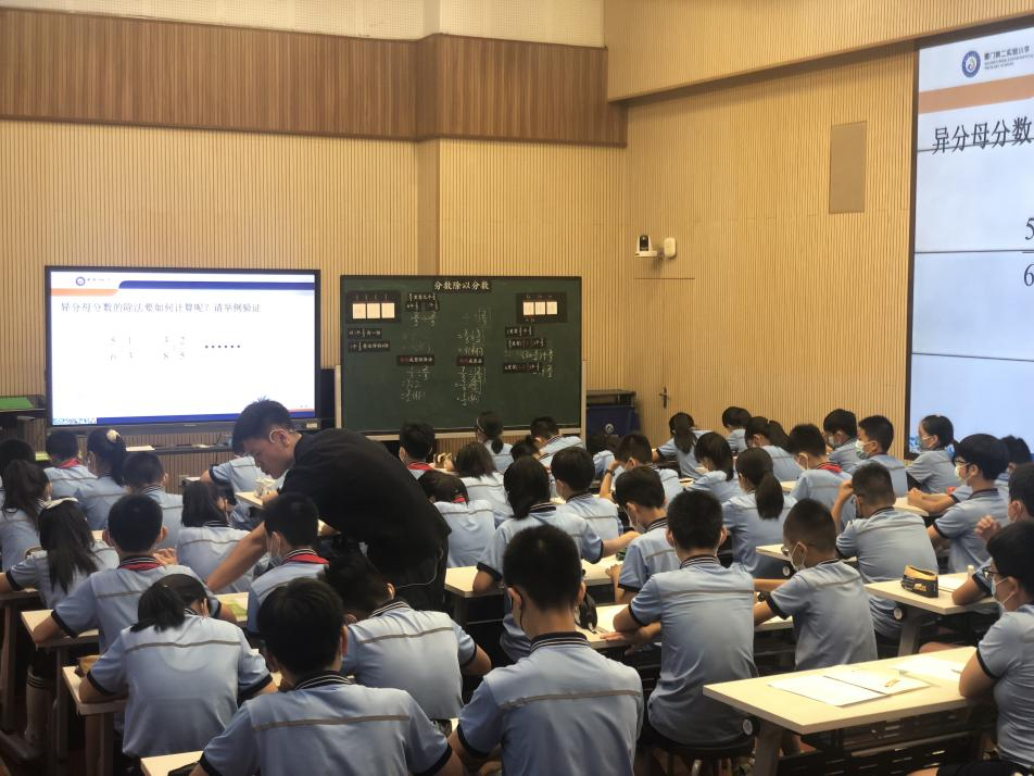 第二节课是由我校许可老师带来的《分数除以分数》。许可老师开门见山,直奔主题。以有趣的数学问题,辅之图形理解,带领六年级的学生进行了一次“猜想—推理—验证”深刻体验。学生在自主建立了同分母分数除法图式的基础上,将方法迁移推广到异分母分数除法,借助结构化的学习轻松突破对除法算理本质的理解——还是计数单位的细分。最后,许可老师以幽默风趣的语言,引导学生类比归纳,发现整数、分数、小数在算理、算法上的一致性,实现学生对运算一致性的感悟。