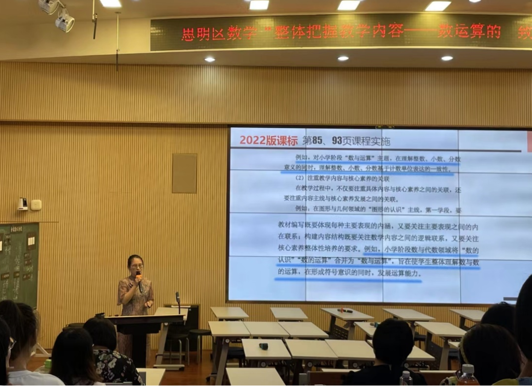 接着我校张肃老师与大家分享了《数运算一致性的案例研究》。张肃老师为我们梳理了2022新课标中关于运算一致性的要求,并从课程内容、学业质量标准、课程实施等方面解释了数运算一致性的必要性,又从四则运算意义的一致性、算理算法的一致性、数概念与运算的一致性三个方面详细地阐述了如何在课堂中落实运算一致性的教学策略。张肃老师通过详实的案例,深入浅出地为大家展示了数运算一致性教学的可行性,在场地老师都获益匪浅。
