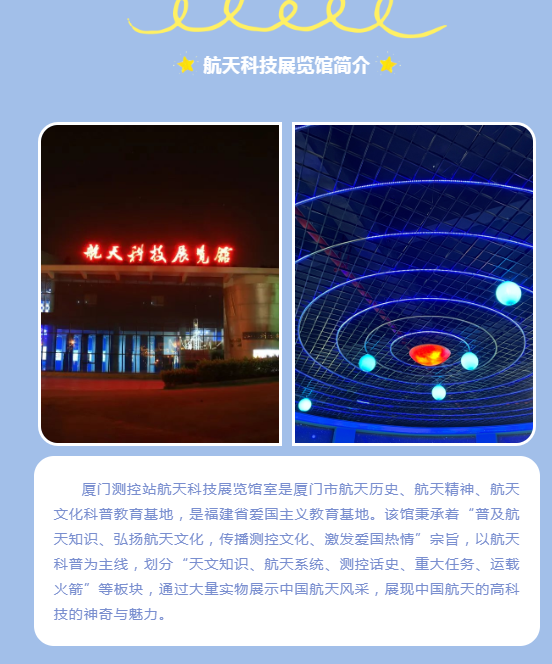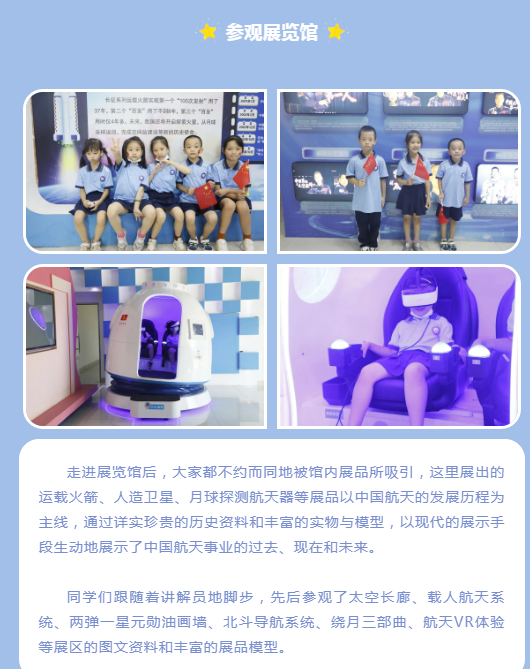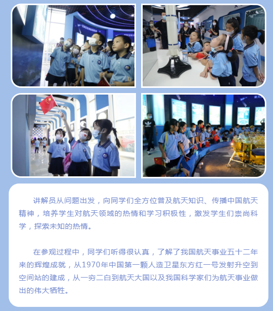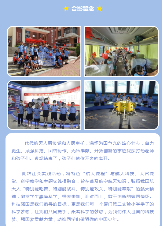 为迎接祖国生日的到来,2022年10月1日,厦门第二实验小学总校2021级2班开展“喜迎华诞,欢度国庆”社会实践活动。星光二班的老师、同学、家长们带着好奇和期待走进厦门测控站航天科技展览馆,感受航天文化,学习航天历史,普及航天知识,领悟航天精神,播种航天梦想。