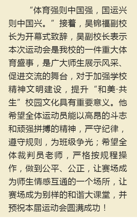 为了全面贯彻党的教育方针,落实教育“双减”政策,推进我校体育素质教育,增强学生的身体素质,树立“健康第一”的观念和终身体育锻炼的意识,2022年11月9日下午,“奋斗吧,追光少年”——厦门第二实验小学第三十二届田径运动会正式拉开帷幕。莅临本次运动会的还有嘉莲街道党工委委员、四级调研员周光武,嘉莲派出所洪天宝所长,嘉莲街道刘昌泉老师,盈翠社区主任陈建华,思明区教育局王志伟,厦门市实验幼儿园林远龄园长,厦门市莲花中学李政峰副校长,爱心人士林伟华女士,厦门汉印电子技术有限公司林泳先生,赖斐鸿先生、张燕婷女士等家委代表,还有王国成校长、柯聪明校长、何丽珊书记等关工委的爷爷奶奶们。
