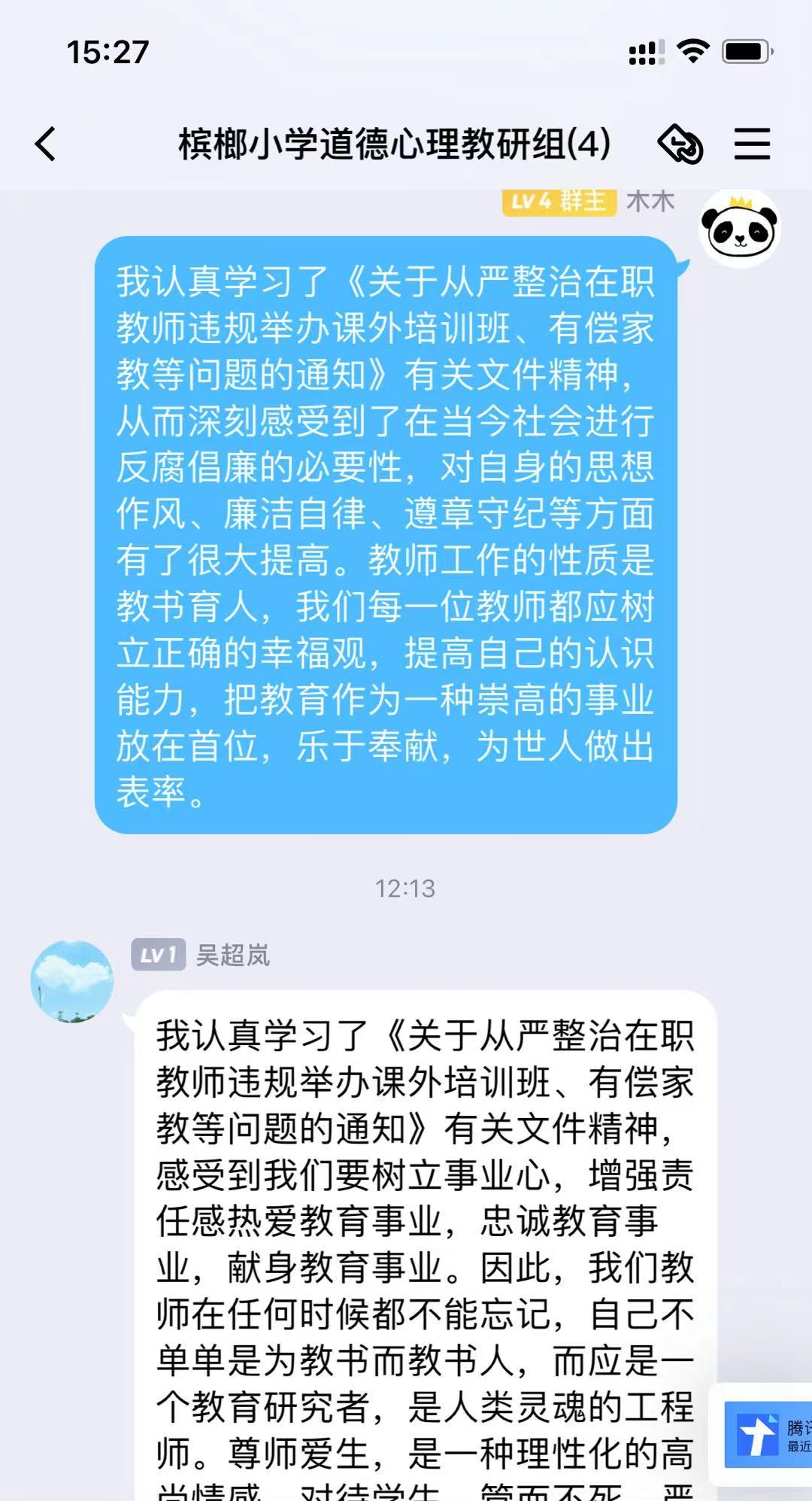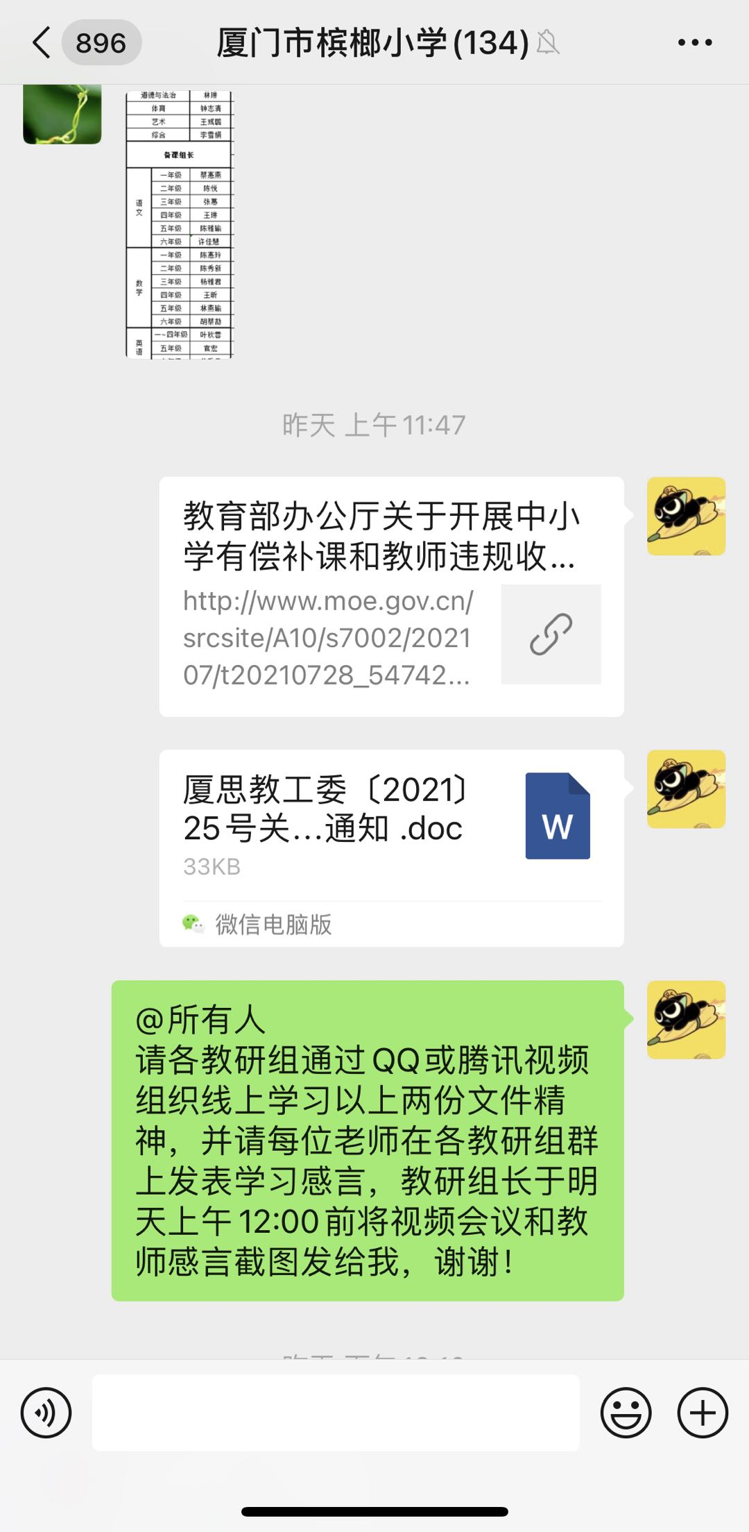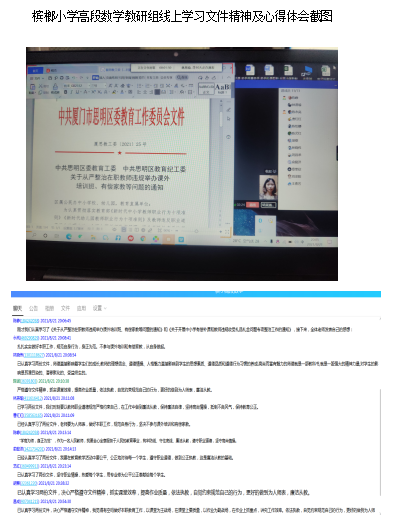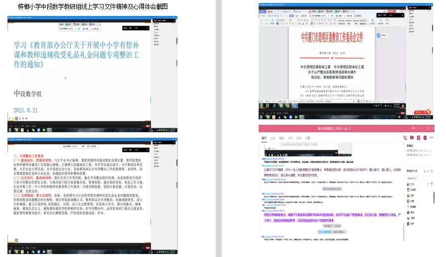 我校教师已于8月21日进行了师德师风学习活动,了解了“双减”意见及《中共思明区委教育工委中共思明区教育纪工委关于从严整治在职教师违规举办课外培训班、有偿家教等问题的通知》,并在本周内集中开展了有偿补课查处专项行动。各教研组通过线上学习文件精神,抒发心得体会,表达了遵守师德规范、严守职业道德的决心。