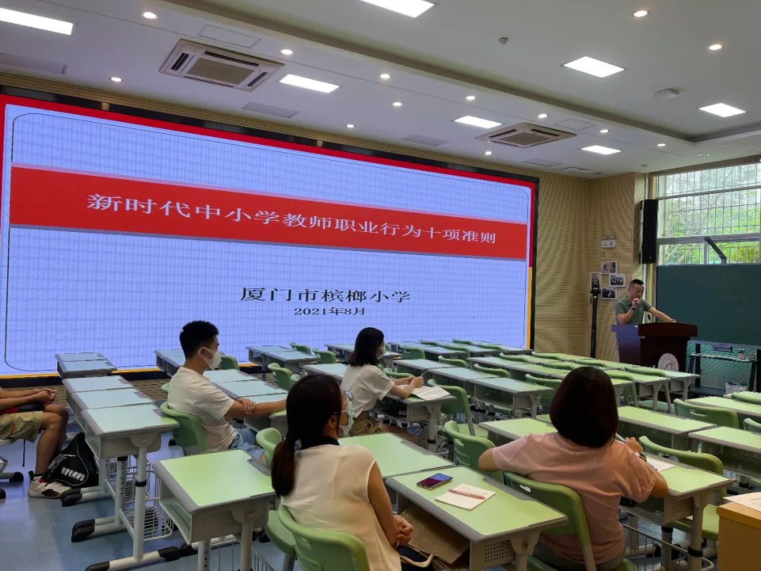 为切实传达中共中央办公厅、国务院办公厅印发的《关于进一步减轻义务教育阶段学生作业负担和校外培训负担的意见》(“双减”意见),同时,进一步提升教育质量,规范教师职业道德行为,厦门市槟榔小学于2021年8月28日在多媒体教室开展以学习“双减”意见及相关文件为主要内容的教师大会。