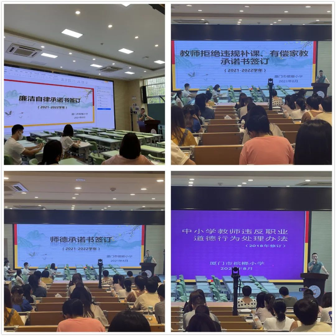 会上,姚旭副校长首先带领大家回顾学习了《新时代中小学教师职业行为十项准则》及《中小学教师违反职业道德行为处理办法》,从“当为”与“不当为”两方面阐述了教师职业道德行为,特别强调了在即将到来的教师节、中秋节槟小教师应当如何廉洁自律和树立教师德高为范的正面形象。老师们通过学习再次明晰了“言行雅正”与为人师表当以身作则、廉洁自律等教师应有的高尚品德,了解了行为失范的不良影响和后果,签署了《师德承诺书》、《廉洁自律承诺书》、《拒绝违规补课、有偿家教承诺书》等文件。