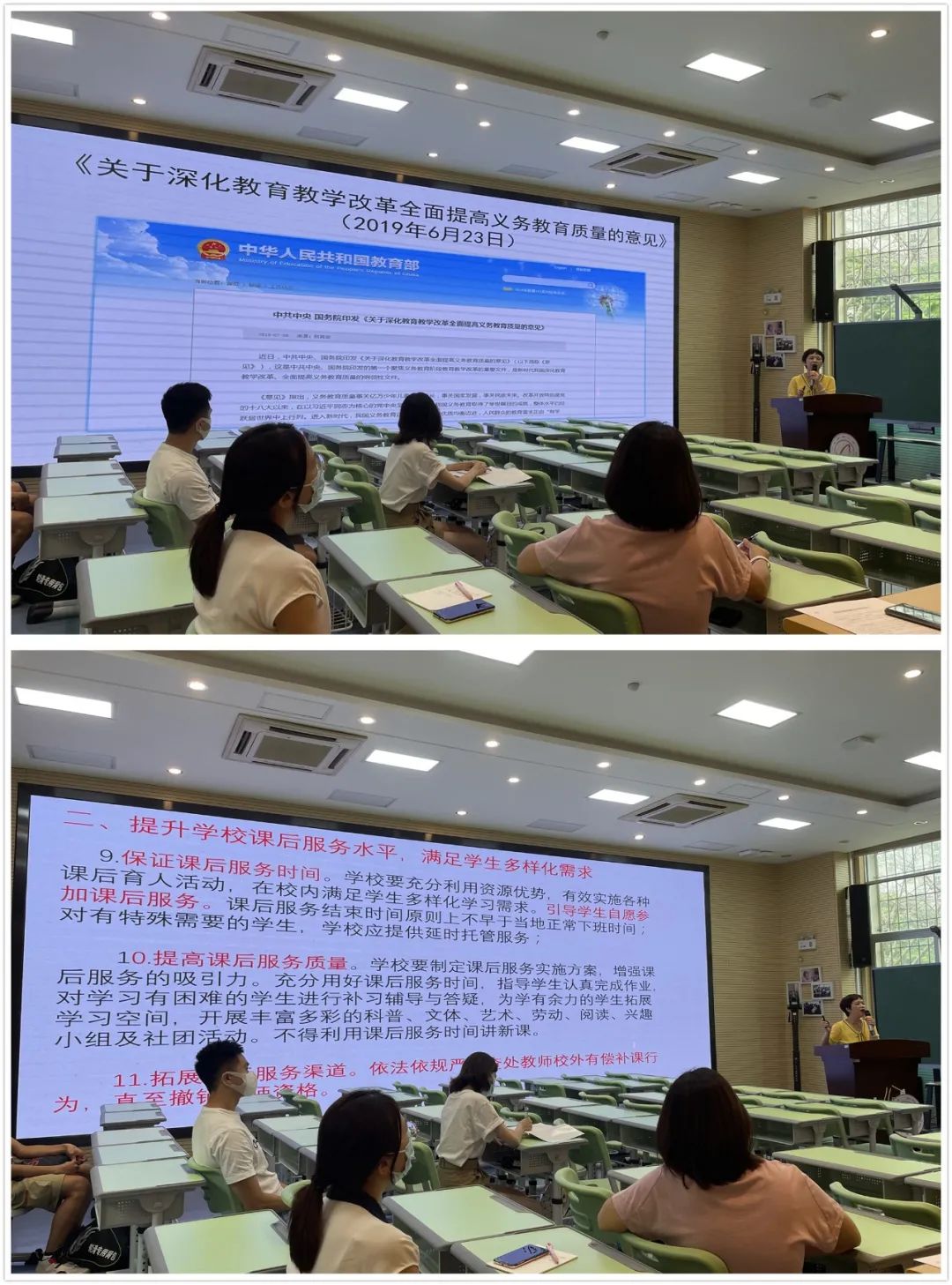 随后,王素芳副校长通过中共中央办公厅、国务院办公厅印发的《关于深化教育教学改革全面提高义务教育质量的意见》、教育部《关于进一步加强中小学生睡眠管理工作的通知》等五项管理工作通知以及相关文件作为背景,传达部署了我校落实“双减”意见的工作。她从“全面压减作业总量和时长,减轻学生过重作业负担”、“提升学校课后服务水平,满足学生多样化需求”等方面对我校教师的教学质量提出了更高的要求,使老师们明确了优化教学方式、提高教学效率的进步目标。