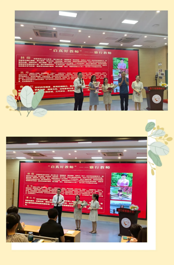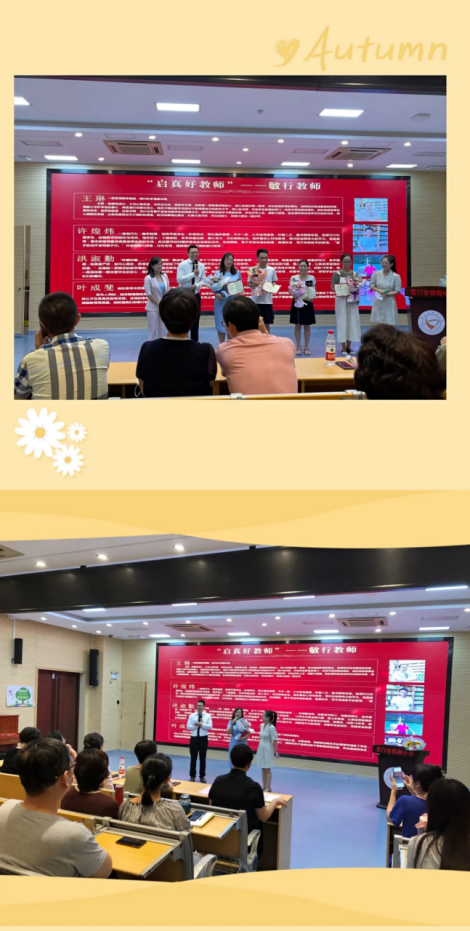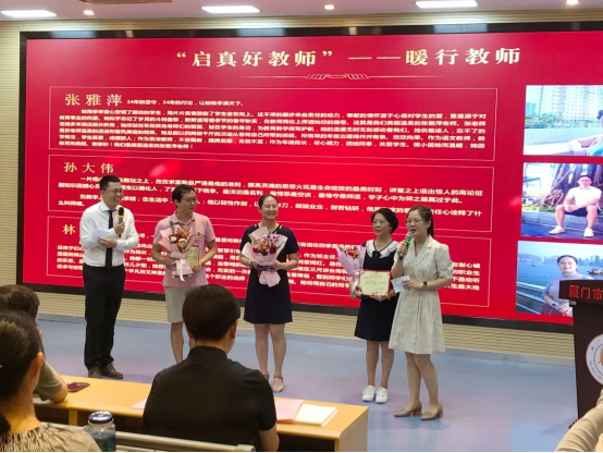 第一届的“启真好教师”——吕珈臻校长、林文美老师、施丽云老师和陈峥老师、翟林坚老师上台为他们颁奖。作为槟榔小学“草根”评选,是学校“行真”文化的一个展示面。由上一届获奖教师颁奖,也是一种精神的传承。虽然是简简单单的一纸奖状、一束鲜花,但在槟小老师的心中分量依旧。