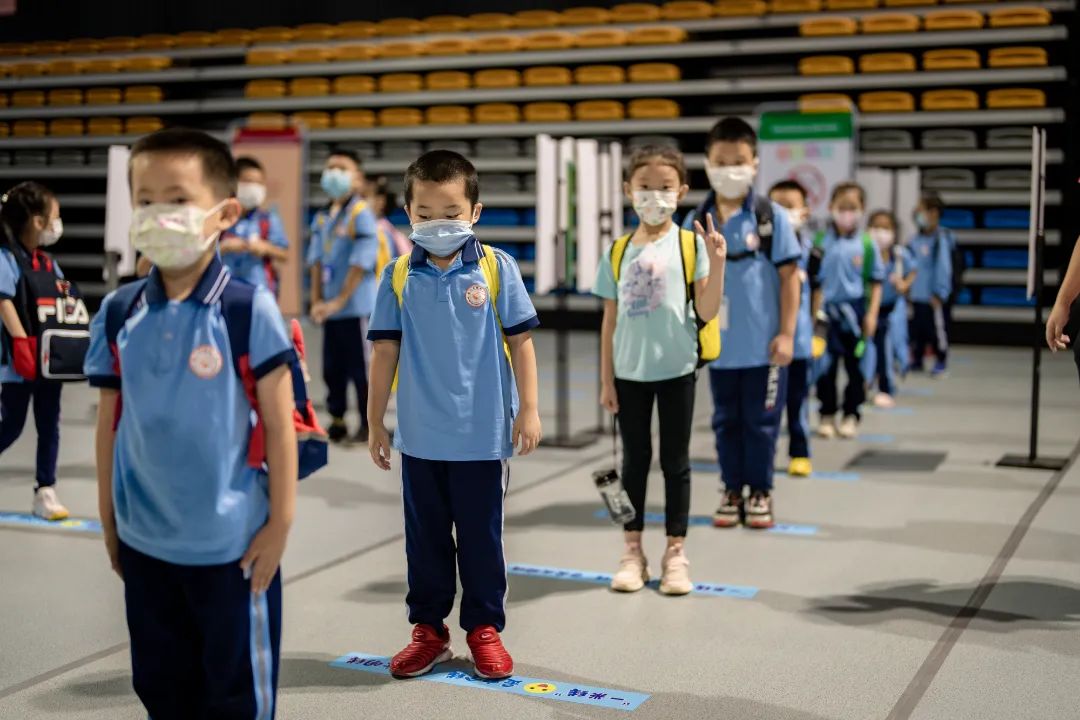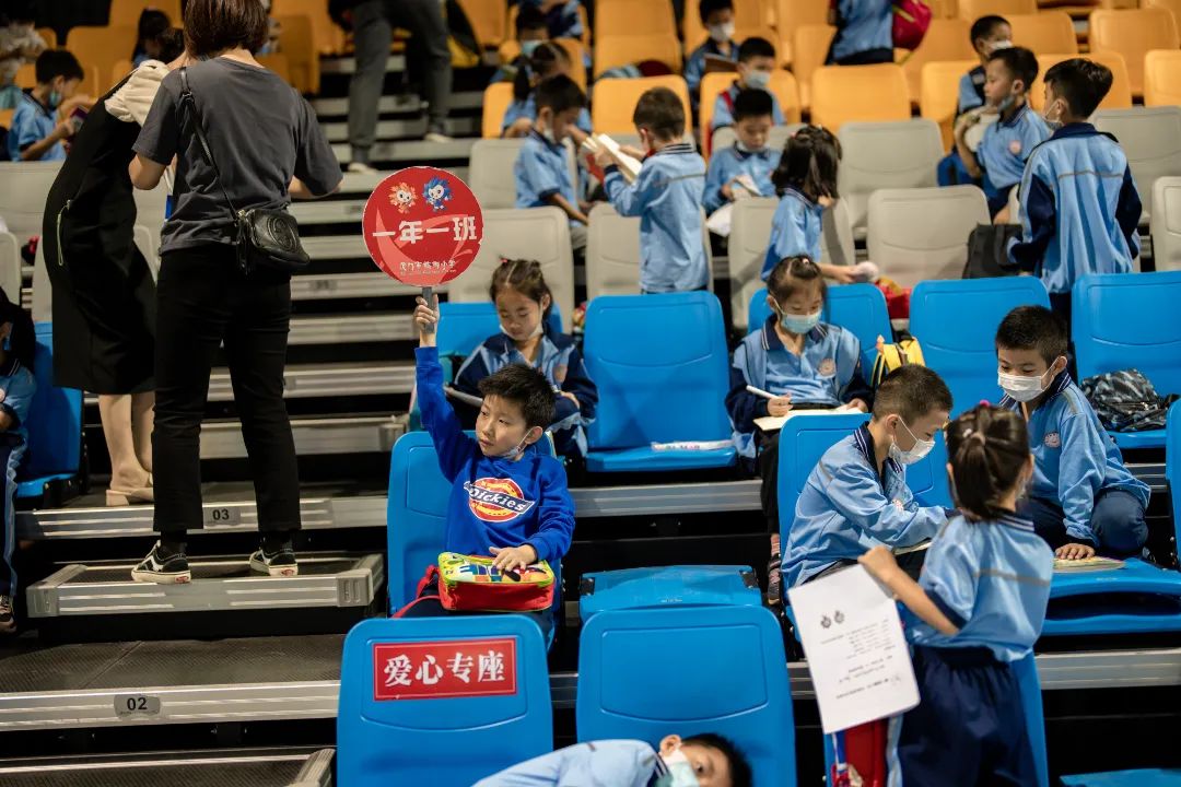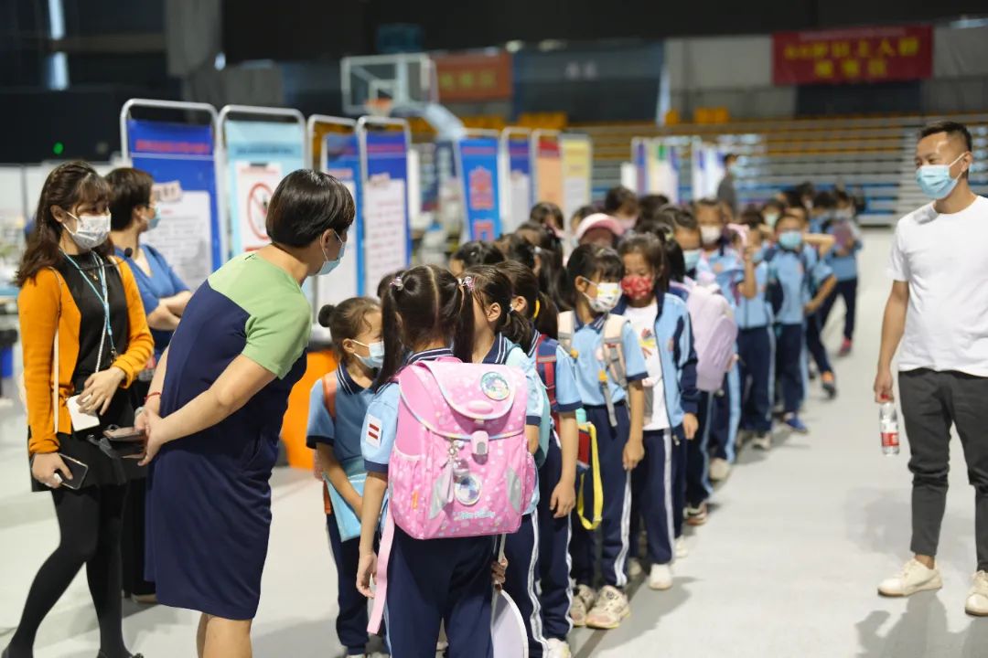 在会场中,槟小少年们安静地排队,校长、老师们引导学生有序接种,抚慰孩子们。接种后,大家自觉到指定区域坐好看书,规定时间后由带队老师整队带回学校。