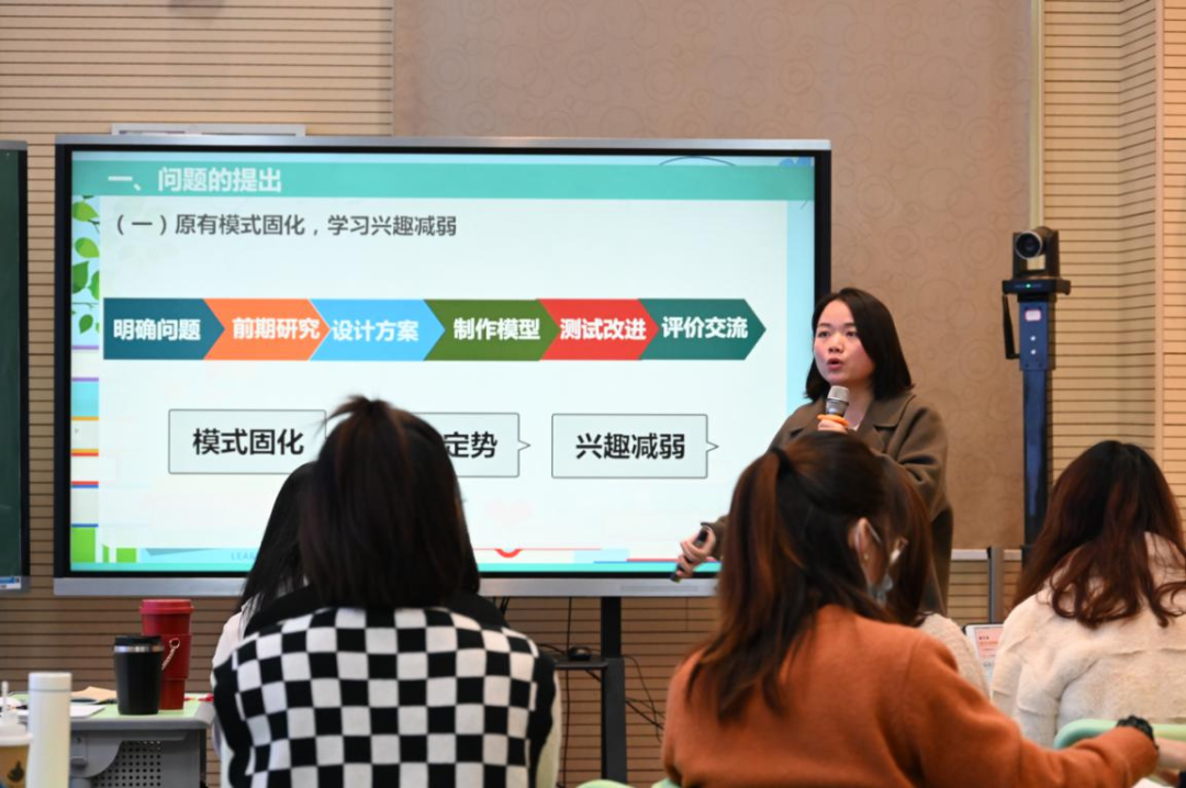 随后是滨海小学孙娜老师带来的讲座《STEM高效课堂的6E教学模式》。在课堂实践的基础上,针对STEM教学的代表性问题,孙娜老师提出了STEM课堂的“六阶段六要素”的6E教学模式,为STEM教学提供了一种可供选择的新范式。通过三个案例,详细阐述了如何作用6E教学模式进行STEM教学,令在座科学教师深受启发。