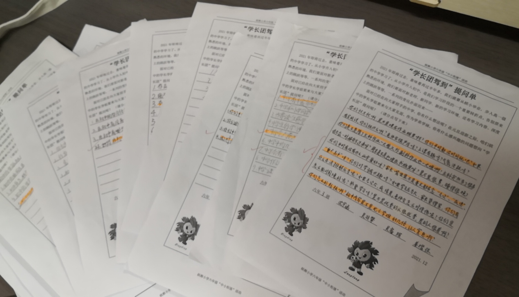前期准备期间,通过全年级的问卷调查,各班小队将问题讨论后填写,再由各中队筛选出问题进行年段汇总。看到这一连串的小问号,似乎和当年的自己一样,面对着未知的新生活,有着同样的不安和忐忑,学长学姐非常有耐心地对这些问题一一做了解答,温暖又有力量的话语化解了在场的大家对未知的焦虑和不安。