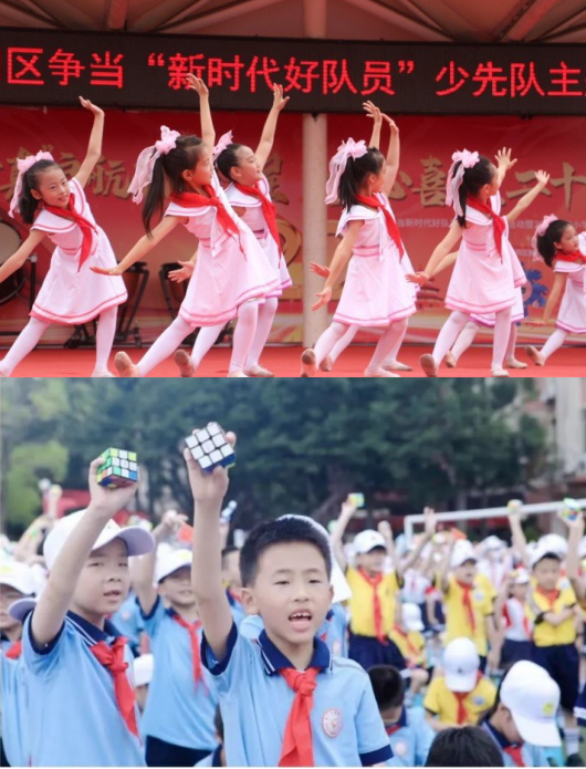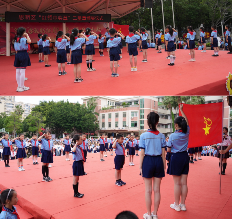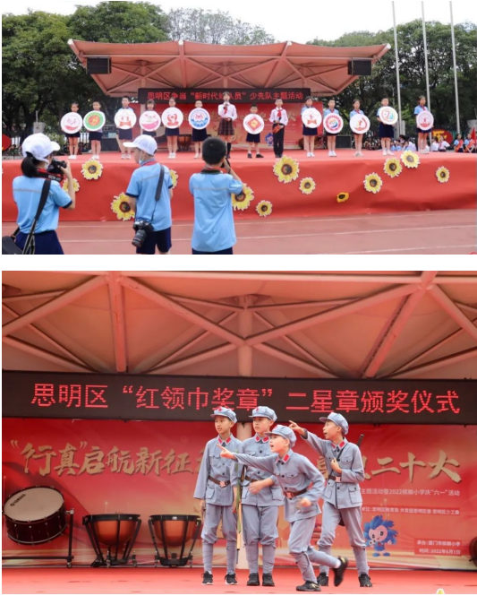 接着,槟小少先队员们用自己热情洋溢的表扬,展现当代少先队员的风采。展示的节目有健美操表演、益智器具百秒挑战、快板情景剧《星星火炬伴成长槟小少年齐争章》、跆拳道表演、合唱《和你在一起》、管弦乐演奏《西班牙随想曲》。随后,进行了思明区”红领巾奖章“特色章展示和思明区“红领巾奖章”二星章颁发仪式。