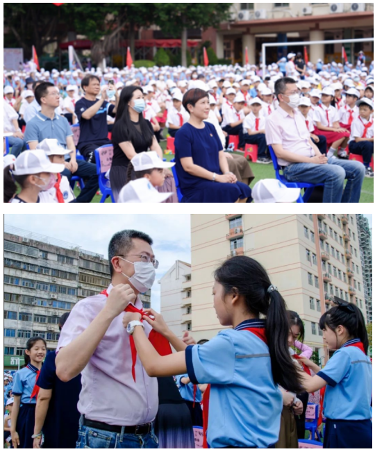 红领巾是理想的传承,首先由少先队代表为领导、来宾佩戴红领巾,并举行一年级新队员入队仪式。