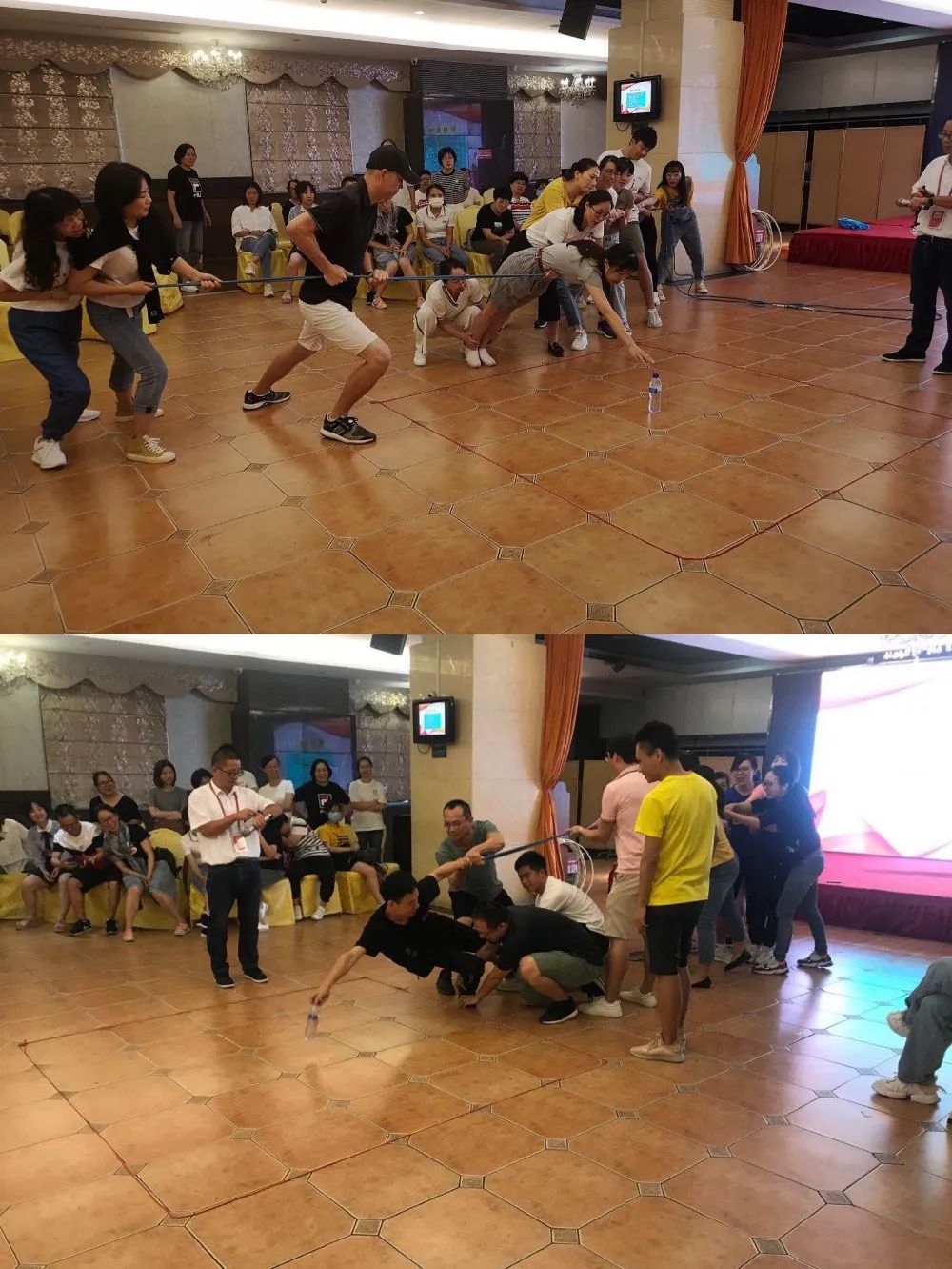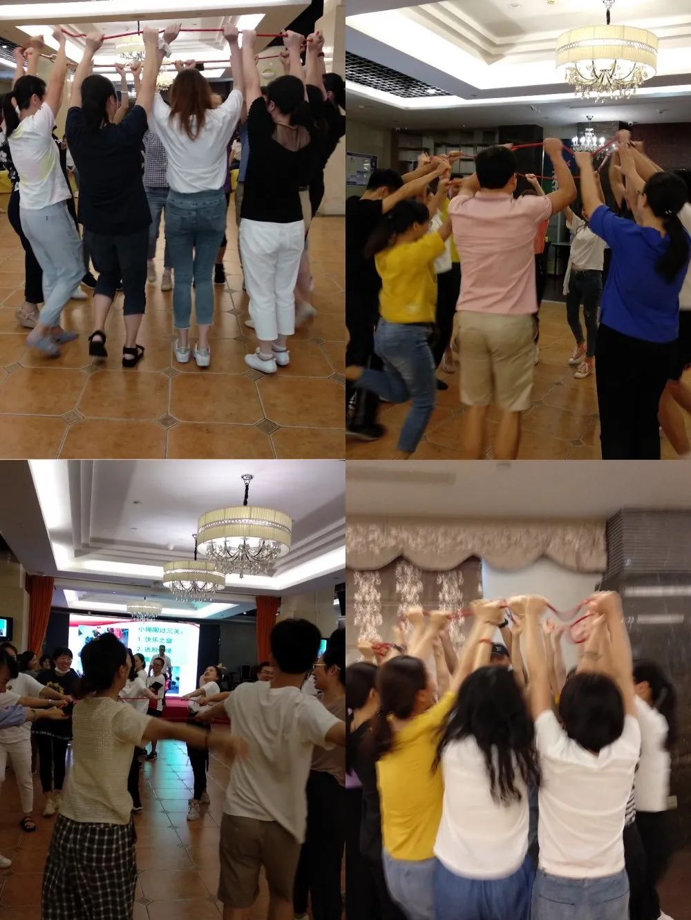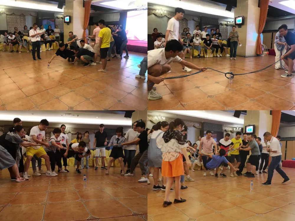 合作与竞赛单元包含合作挑战(小绳圈过关)、互帮互助(大海求生)、合作创新(智取核弹)三个小游戏。各个小队在挑战中一边实践一边改进,队员们献计献策,运用集体的智慧,寻找不同的过关方法,老师们体验到了团结的力量。