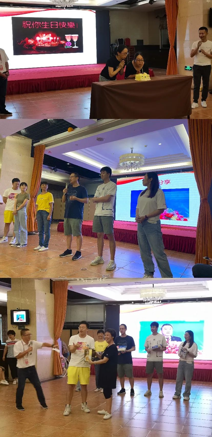 在“快乐分享”过后,第一天的团队心理拓展主题活动渐进尾声。王副校长为获胜的小队颁发了“战利品”,姚副校长代表蔡校长和学校给活动当天生日的陈妙清、苏静萱两位老师送上了生日蛋糕——老师们齐唱生日快乐歌为她们庆生,会场洋溢着槟小团队的温暖与幸福。