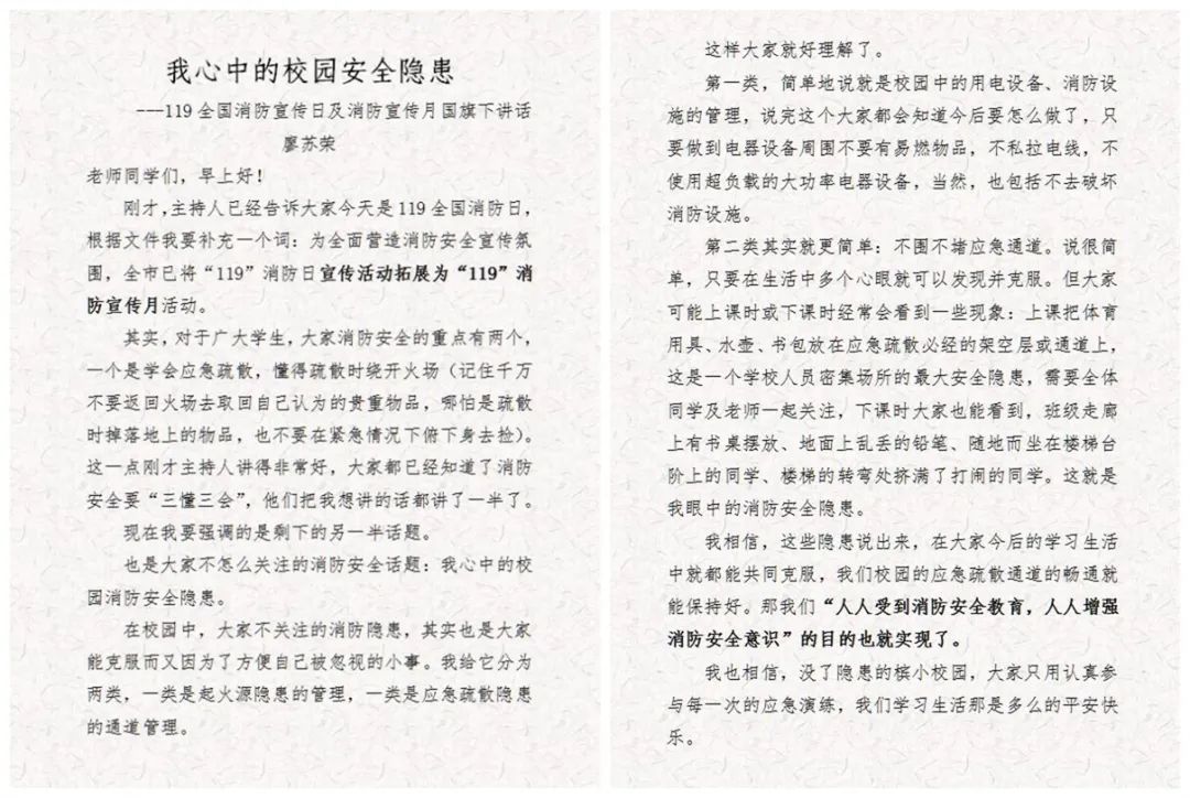 集合整队后,大队委李艾珈和主持人林王炫就援引去年全国消防安全事故的数据提醒同学们要提高防火意识和技能。随后,廖老师也利用国旗下讲话的机会,小结了刚才的演练成果,同时号召全体师生“人人受到消防安全教育,人人增强消防安全意识”。