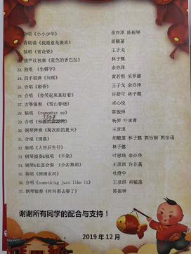 1.策划:学期初教师就告诉学生期末要召开班级音乐会(孩子们一般会等到12月份才开始各种忙碌),商议音乐会主题,要求人人参与,可以根据自己的爱好、特长,自选内容、表演形式、合作伙伴、节目负责人、主持人、摄影摄像、DJ等。