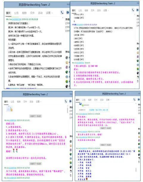 英语组充分发挥主观能动性,以组长为中心,组织好线上教学计划、教材培训学习和单元总练习检测等活动的安排,努力规范老师的教学行为,为学生服务,共同完成线上教学任务。