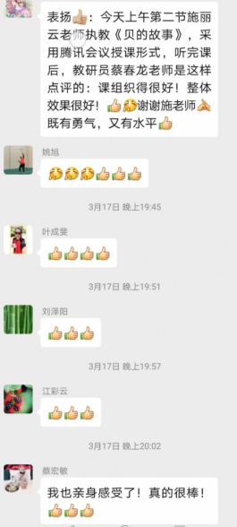比如,每天线上学习后,蔡校长会致电部分老师,关心询问线上教学遇到的困难和需要的帮助,同时也鼓励老师们大胆尝试,让老师们在繁重的线上教学任务中体会到学校的关心。又如,蔡校长、王副校长、蒋主任每天都会随机加入班级群,听各学科的随堂线上课。听课后会跟老师交流,既有表扬肯定,又有指导提醒,并对备课组的线上备课、教研进行指导,让整个线上教学从“授课时间、授课形式、授课内容”上呈现清晰的推进感。此外,教学部门每天下午与各教研组组长的电话会议和沟通协调,也能及时了解各组线上学习情况,商议并解决所遇到的问题。