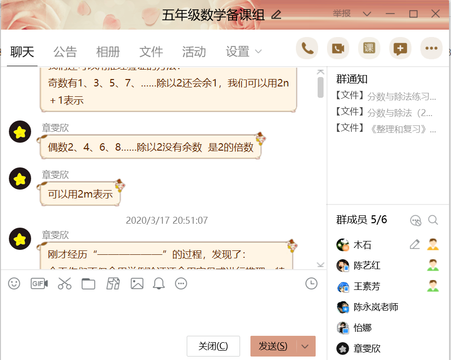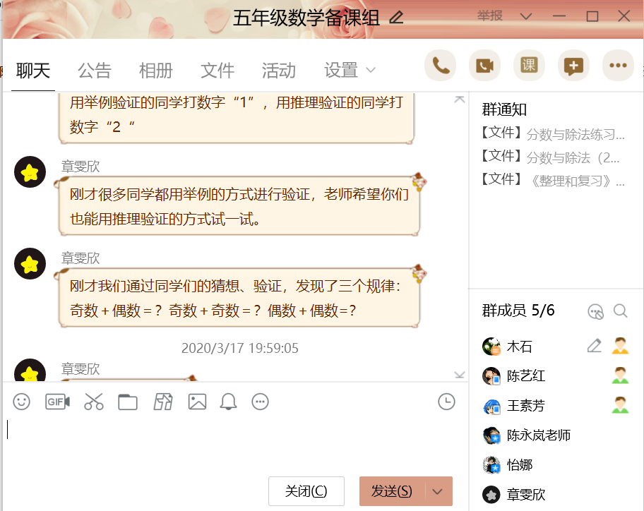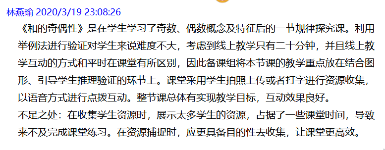 这段时间的线上教学,让我们发现,备课组及教研组的团队合作是线上教学成败的关键。这段时间的备课、制作课件,准备资料,我们感觉到备课组之间更加团结,合作与互助了。虽然老师们的信息技术参差不齐, 但是各有所长,在面对困难时,大家群策群力,一些好的做法和工具都在备课组里分享,交流心得及线上教学发生的乐趣,在笑声中线逐渐形成一些模式,成为大家都能实践的模式,也坚定了大家积极面对困难、扭转态势的决心。