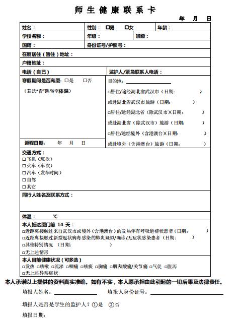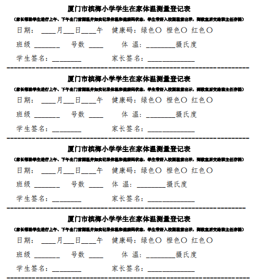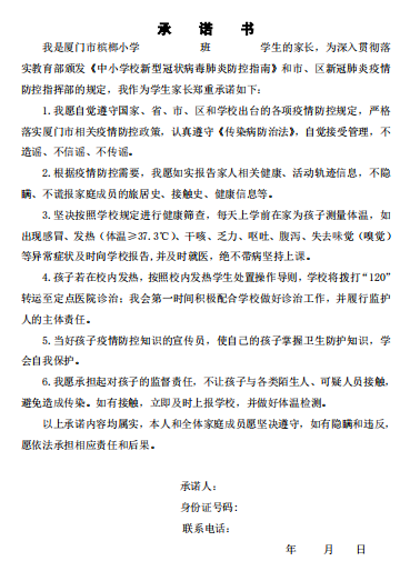 报到当天须携带打印、填好并签名的《槟榔小学学生在家体温检测登记表》、《承诺书》、《家校“点对点”出行安全责任协议书》和《师生联系健康卡》上交给班主任。