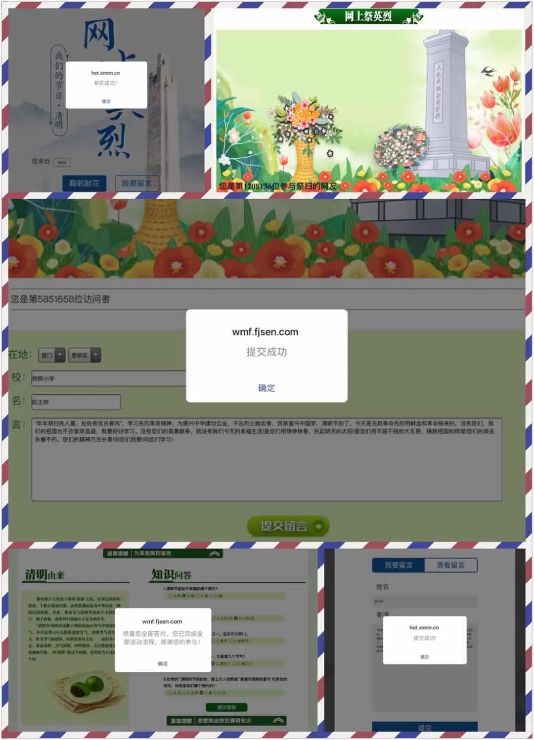 开展“网上祭英烈”活动。组织广大学生登录厦门文明网、进入“思明文明风”微信公众号或利用手机下载APP等形式,在网上向先贤先烈鞠躬献花,抒写感言寄语。参与方式:1.登陆“文明风”首页,点击推荐专题《我们的节日 清明》或直接输入网址:http://wmf.fjsen.com/topic/node_301415.htm2.关注“思明文明风”微信公众号,点击右下方“祭英烈”栏目,留言和鞠躬献花。3.关注“文明厦门”微信公众号,点击 “祭英烈”栏目,进行投票。4.点击厦门文明网网址,在首页显著位置点击投票:http://xm.wenming.cn/tjzt/202003/t20200325_6371299.htm。
