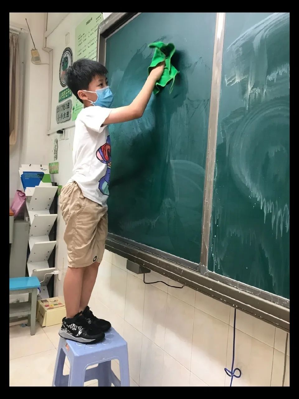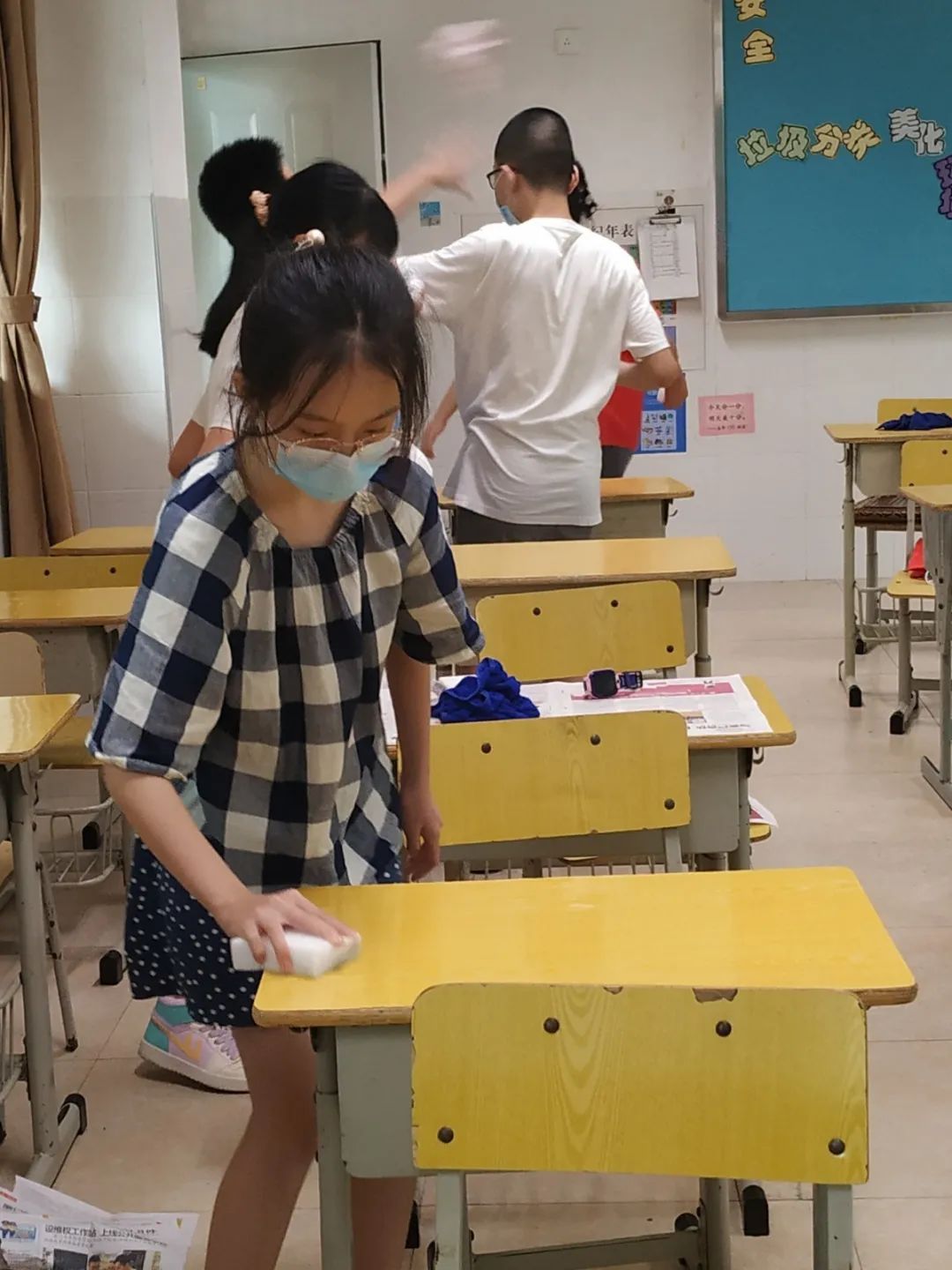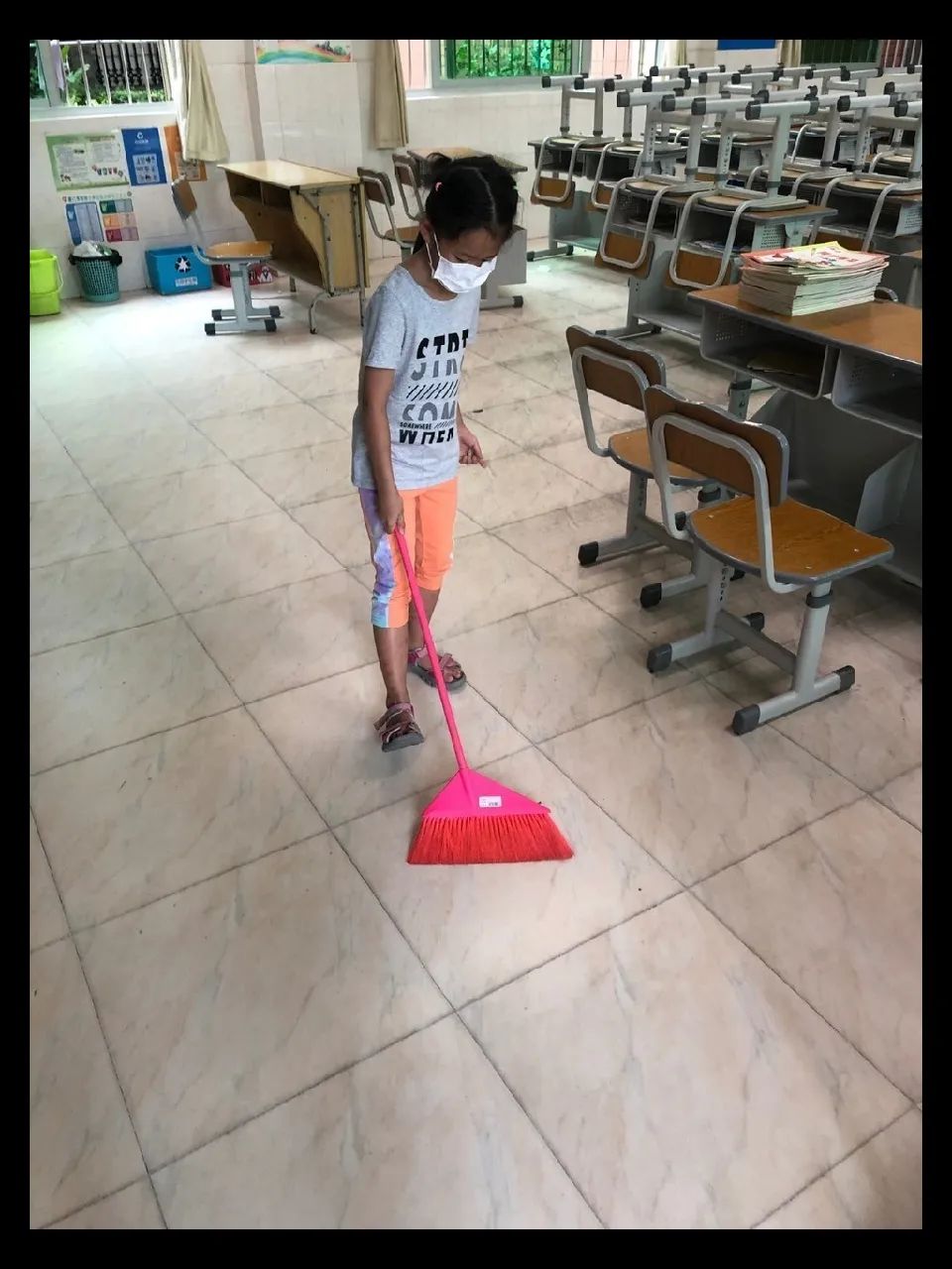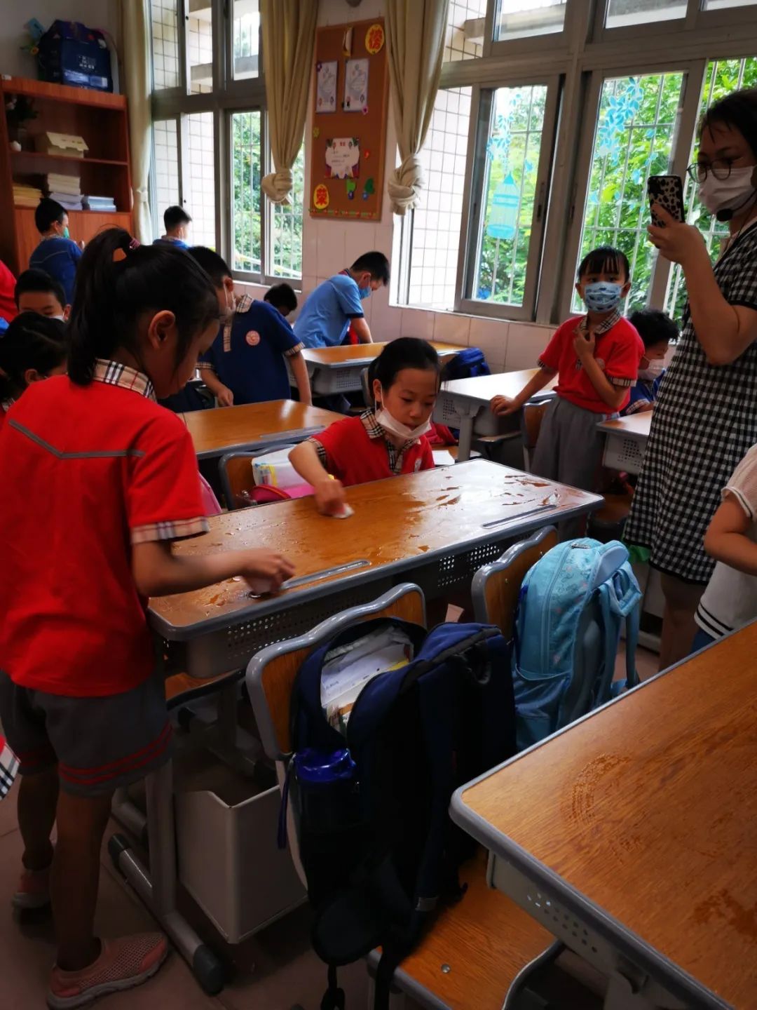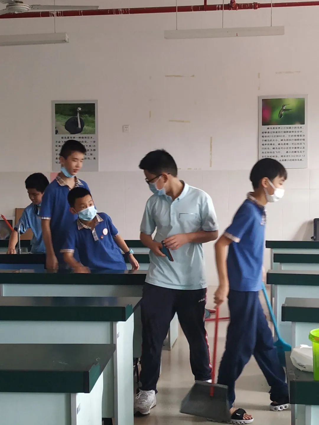 在班会课中各班学习的劳动技能,应当马上应用于实践——这不,下午第二节课起,全校组织了如火如荼的大扫除活动。