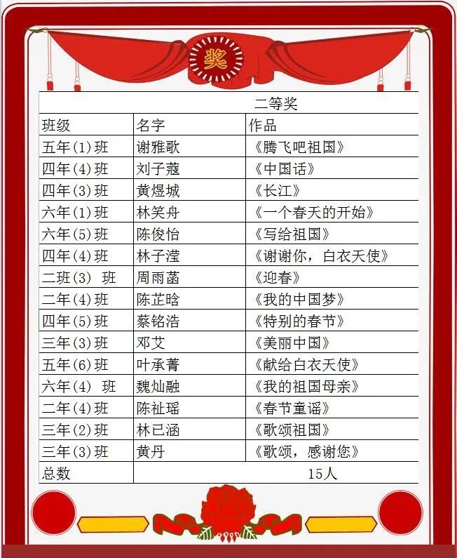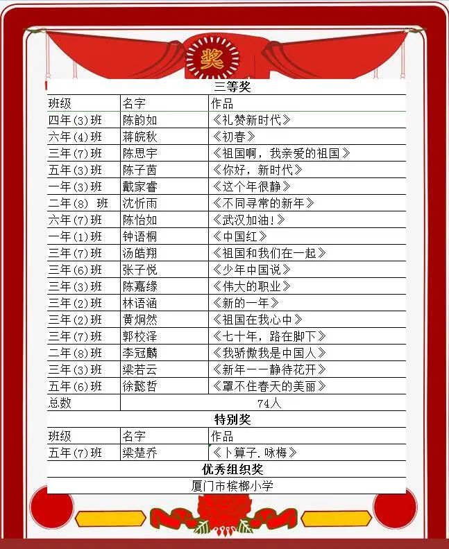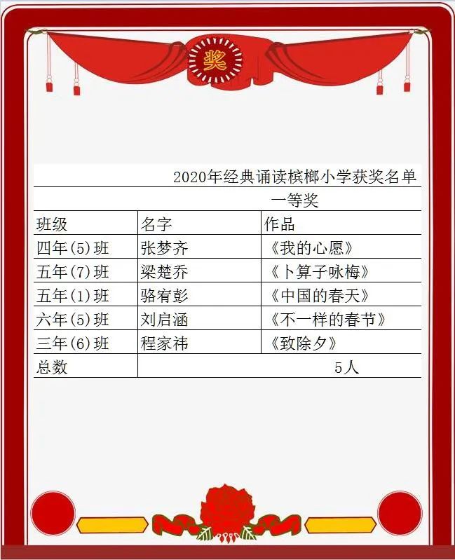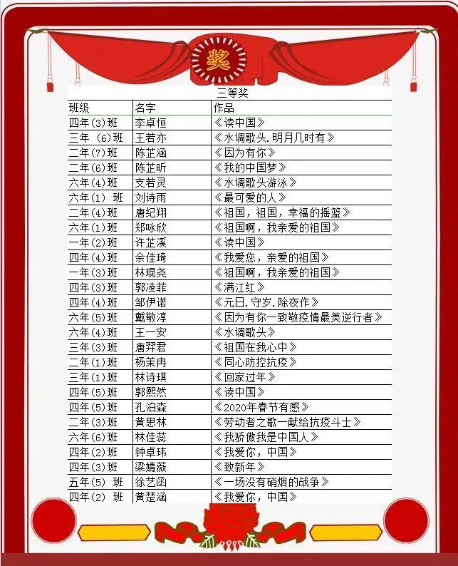 我校在2020年经典诵读比赛中,蝉联优秀组织奖,这正是同学们积极参加经典诵读的结果。在值周中队三年(1)班的大队委主持下,少总陈永岚老师宣布了本次经典诵读活动一二三等奖的同学名单,他们也将获得相应等级的槟榔之星!