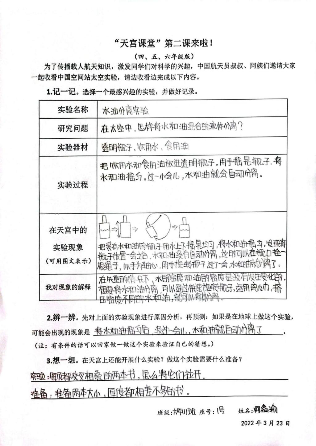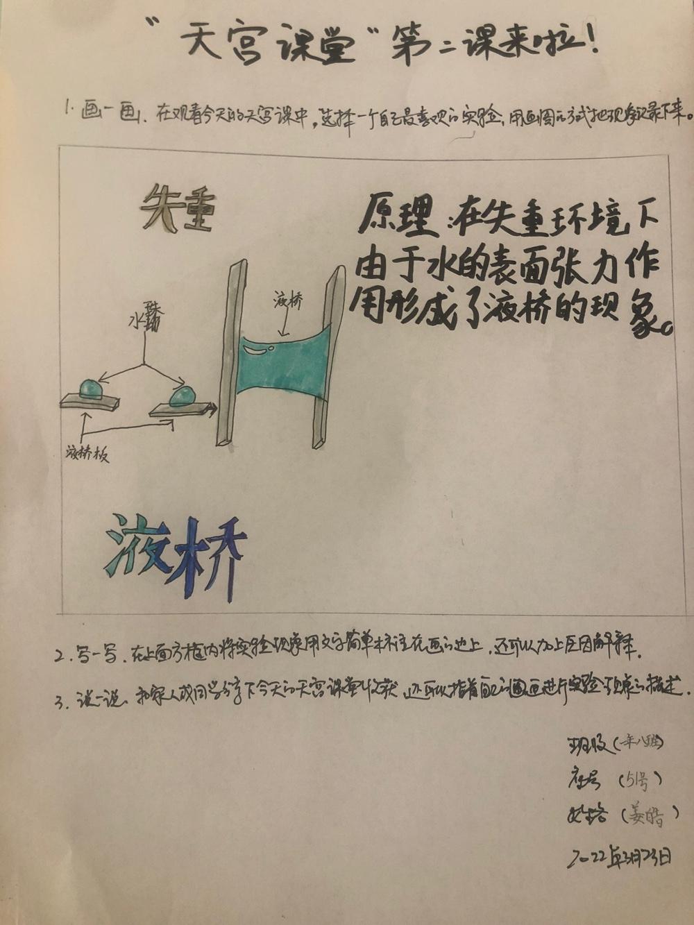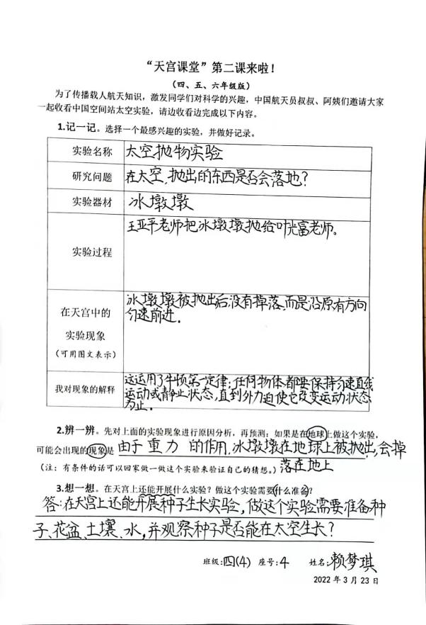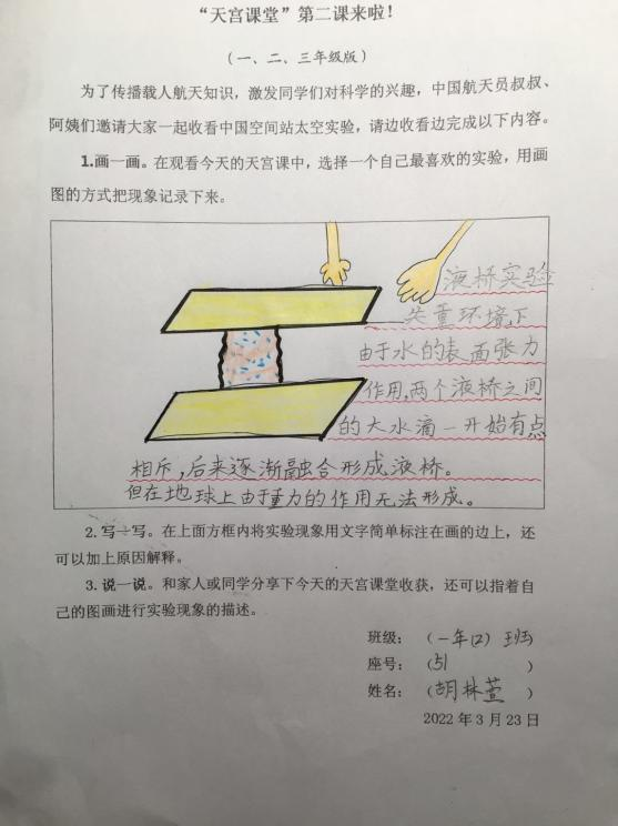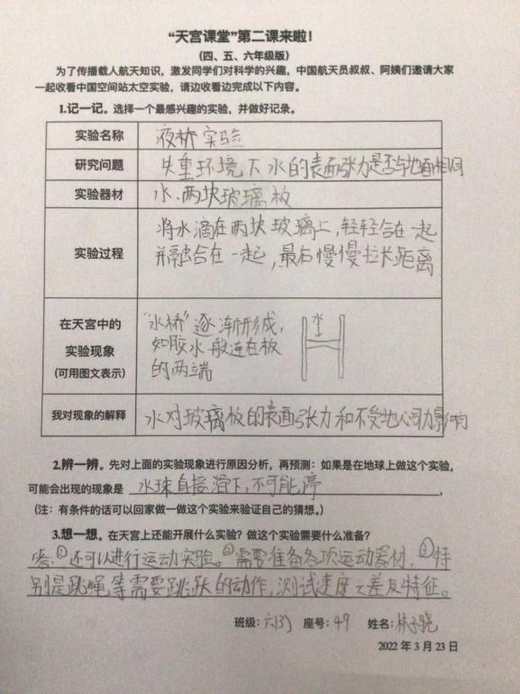为引导同学们主动探究,从天地差异中感知宇宙的奥秘、体验探索的乐趣,学校还给不同年段的学生推送了学习任务单,让学生带着任务去认真观看,鼓励学生根据预告中的实验项目可事先准备一些实验器材,来尝试对比太空实验现象与地面实验现象的不同。