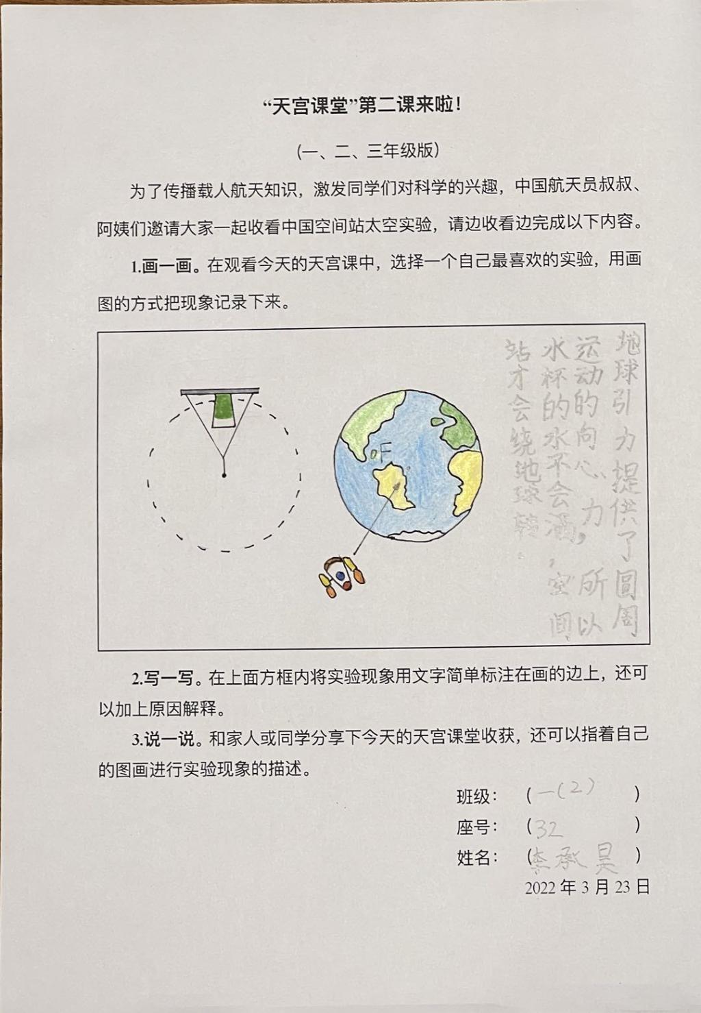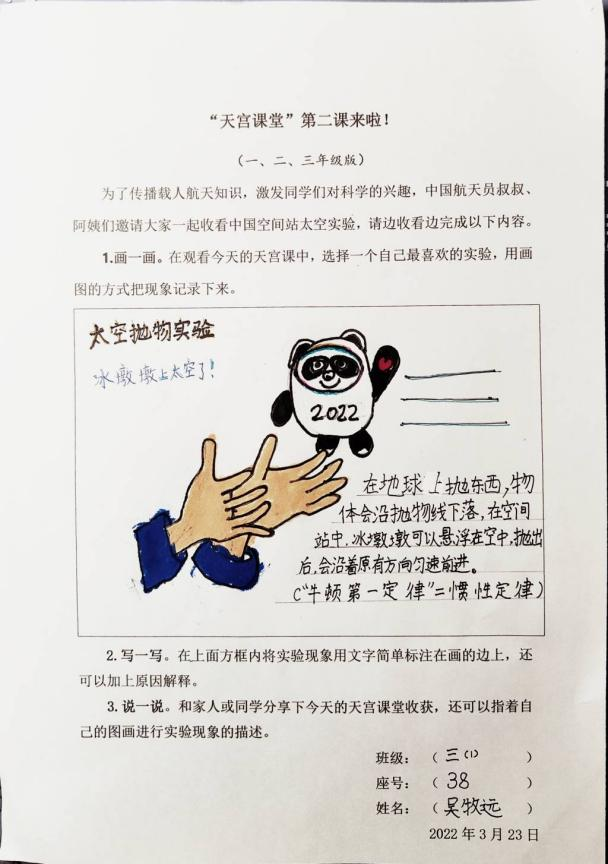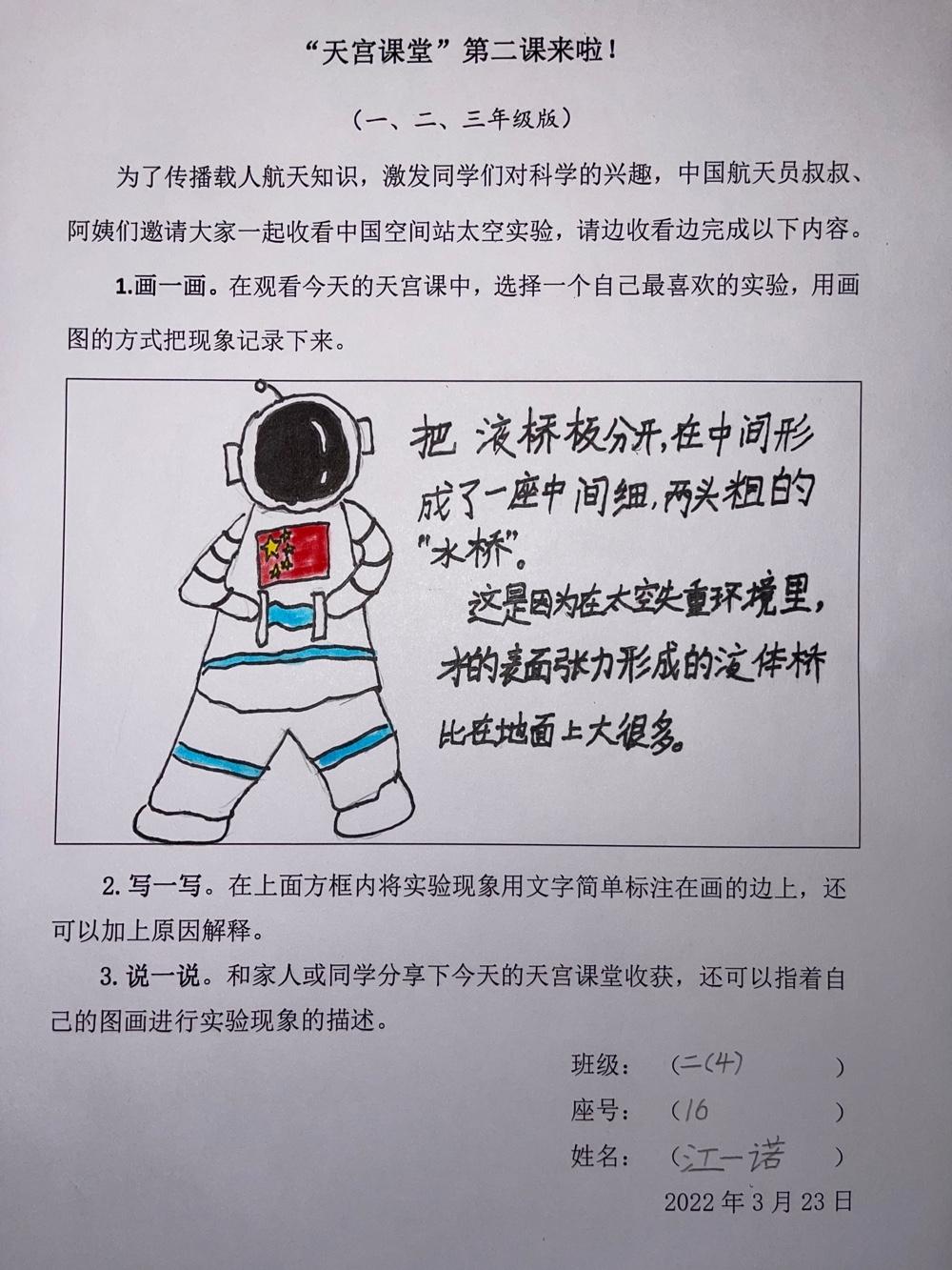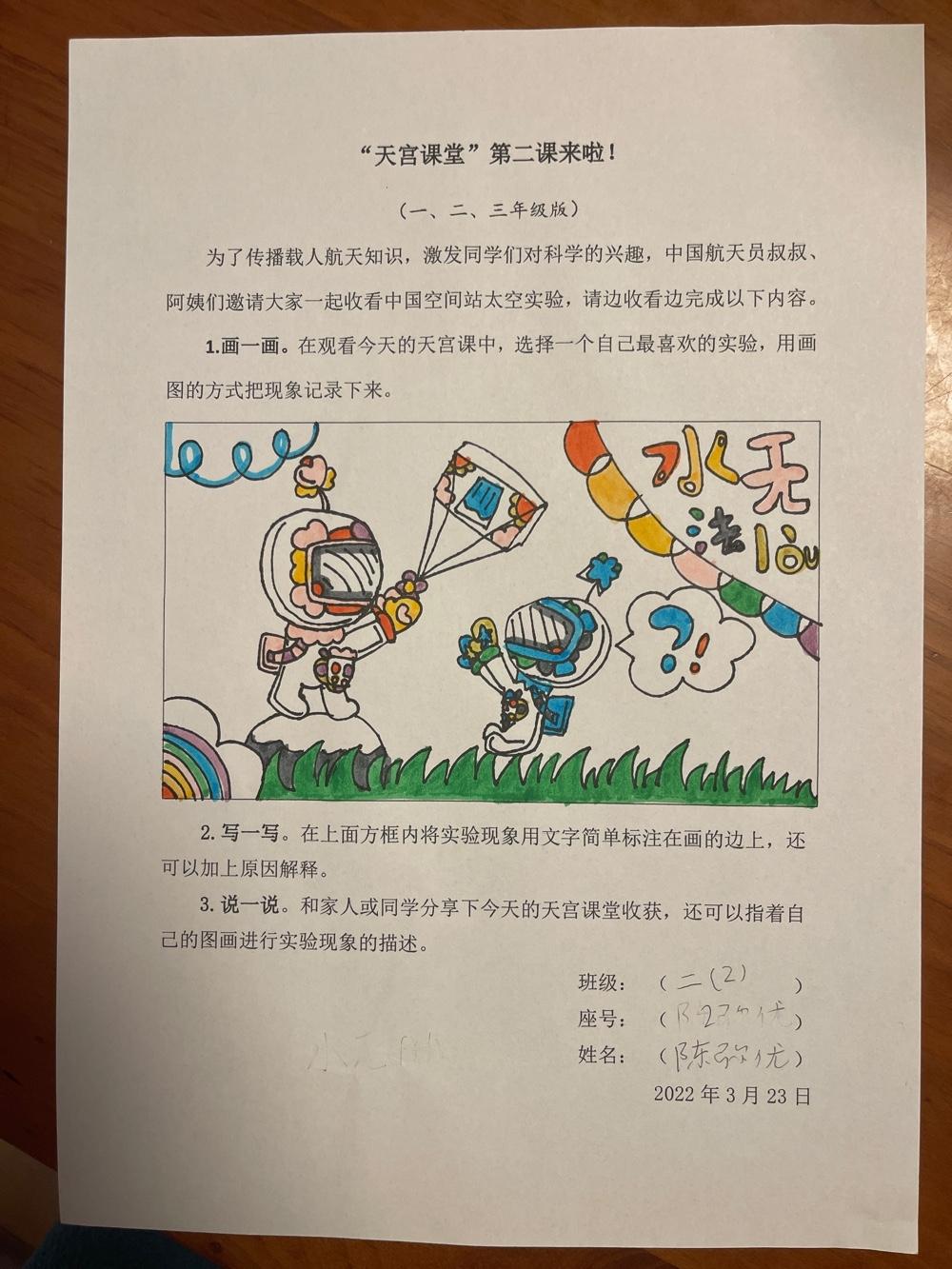 为引导同学们主动探究,从天地差异中感知宇宙的奥秘、体验探索的乐趣,学校还给不同年段的学生推送了学习任务单,让学生带着任务去认真观看,鼓励学生根据预告中的实验项目可事先准备一些实验器材,来尝试对比太空实验现象与地面实验现象的不同。