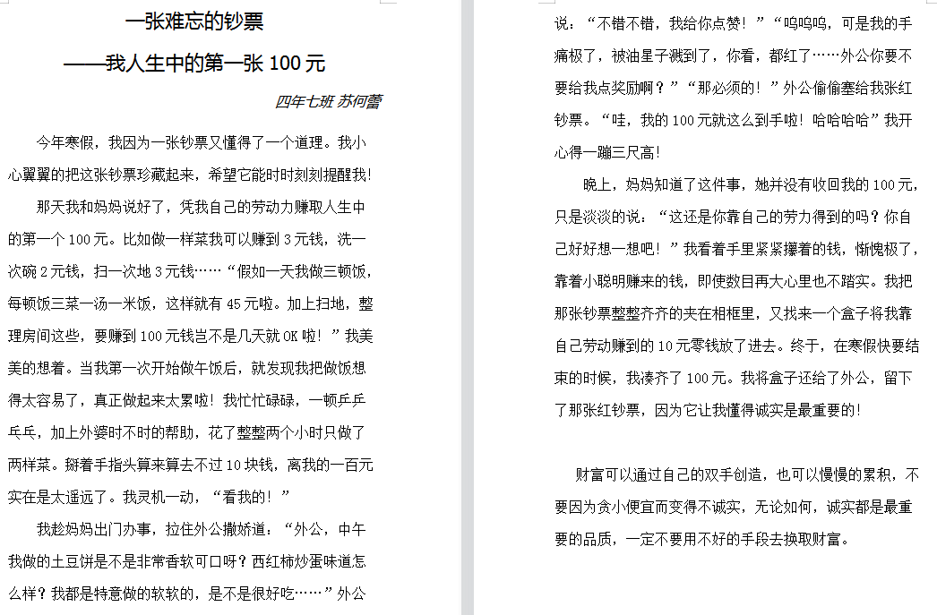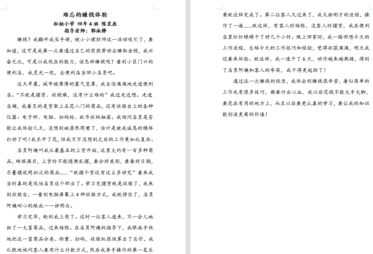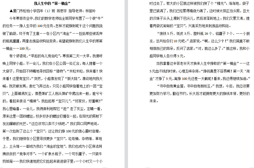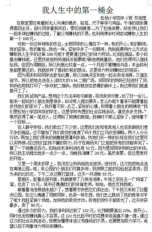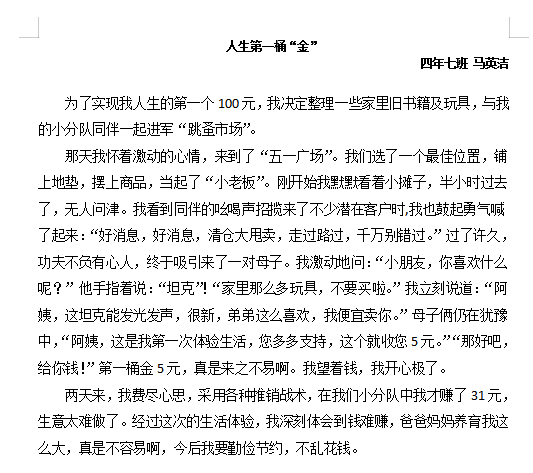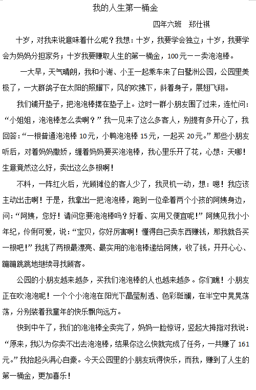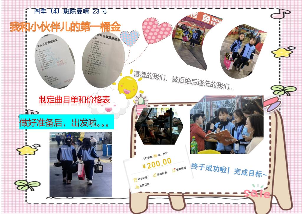 四年级的学生响应学校德育处的号召,积极地参与了“第一个十岁,第一个100元”为主题的社会实践活动,不仅牢记老一辈革命家艰苦朴素的嘱托,还学习了如何使用和管理好手中零花钱的能力,完成人生十岁的一个挑战——赚取人生第一个100元。