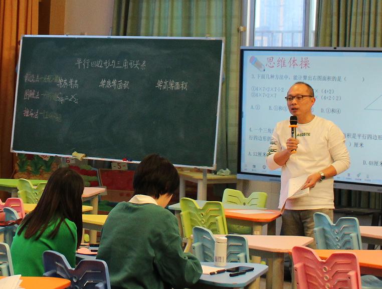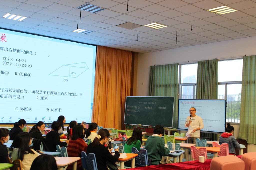 首先由思明第二实验小学李晓敏老师带来一节五年级练习课《平行四边形与三角形的关系》。李晓敏老师打破常规练习课的模式,通过对教材的深入解读和结构化的设计,立足学生的认知起点,用长程两段式的教学模式进行深度教学。李老师以假设法、图解法、推导法引导学生发现、分析问题、证明问题。课堂中李老师以“问题”为发端,唤醒学生的深度思维,以“学习”为核心,驱动学生的深度探究,以“实践”为手段,推动学生的深度研讨,以“反思”为助推,激发学生的深度内省。