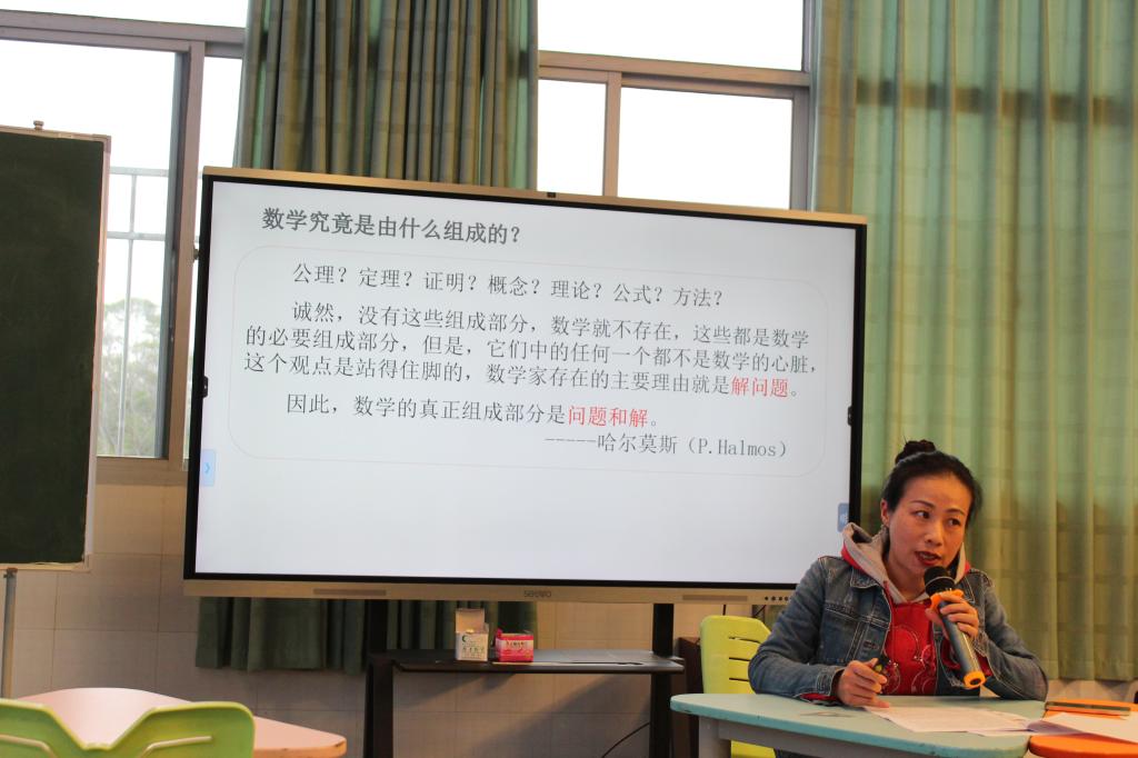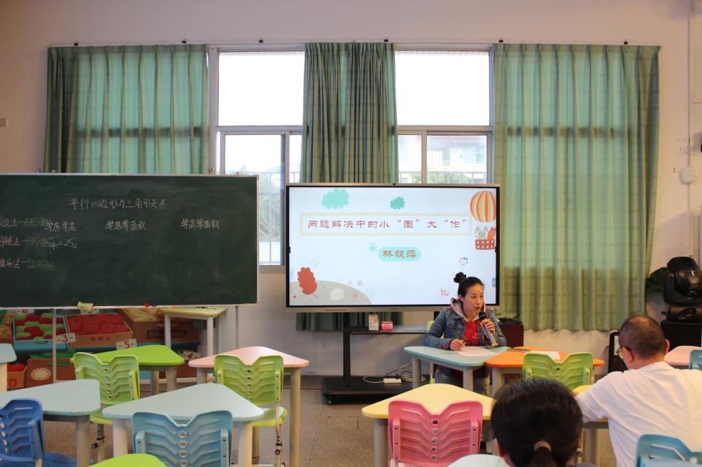 接着由林毅萍老师给大家带来了一场精彩的讲座《问题解决中的小“图”大“作”》。林老师结合了自己的教学实例生动的为我们分享了“数形结合”在小学数学中问题解决的重要作用。林毅萍老师用鲜活的例题讲解了图示法的教学策略,她指出,要培养学生数形结合的思维意识首先要深度激发“图示”的学习需求,其次要让学生深度体验“图示”的实践操作。