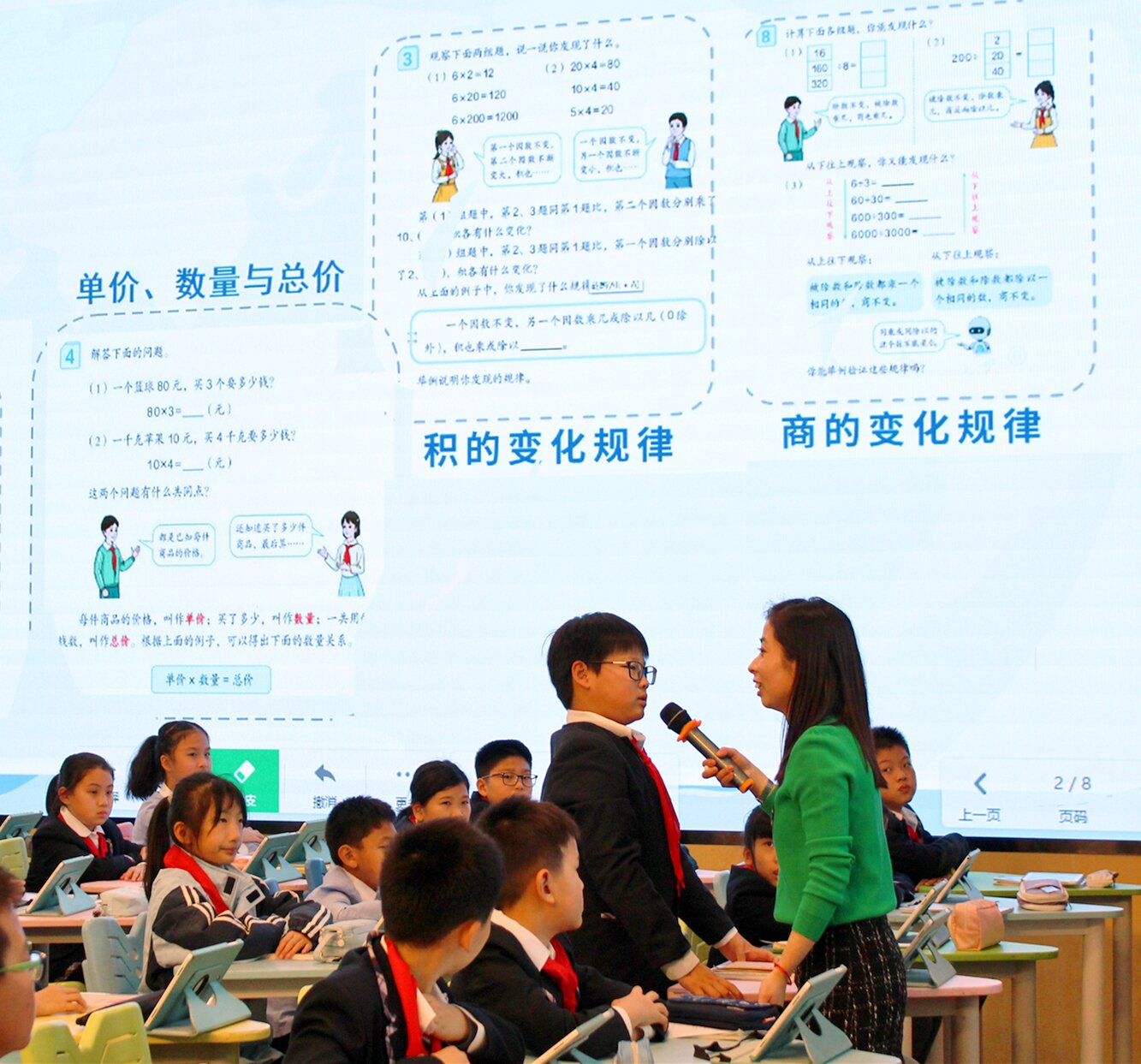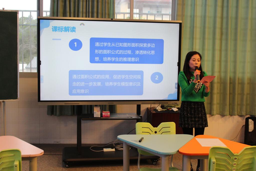 随后,李晓敏老师分享《用方法,悟本质,促思维》,她结合课标目标针对《面积与面积单位》这一单元进行目标解读,同时对比分析人教、浙教、科教三个版本的教材,结合学情情况提出本单元的教学目标,运用我校“慧学模式”从“问、学、践、思”进行教学设计,培养学生的结构化思维。细化每个课时和环节设计意图,设计单元的元知识结构图。最后结合电子书包测后情况进行反思,更好的以行促提。