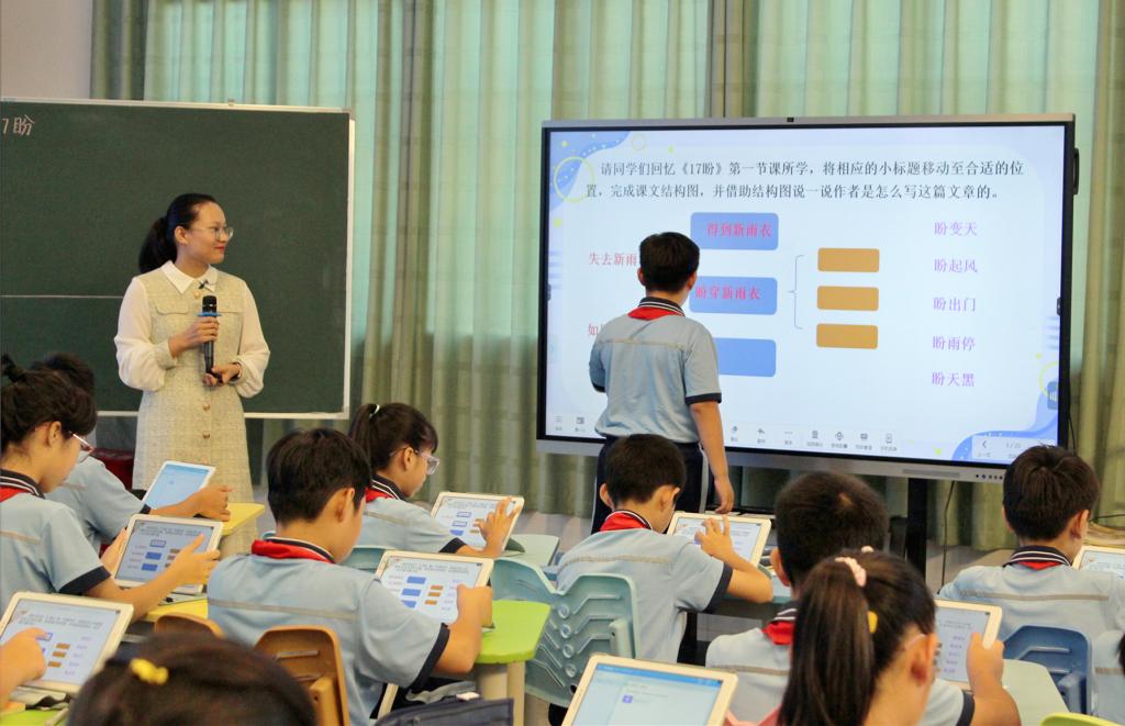 第二节课由厦门市园南小学黄靖老师执教六年级语文《盼》一课,黄老师基于课标、依托教材,紧扣教学目标,精心设计了三个任务:“师生互动,电子检测,把握学情”“品读文本,悟盼之切,体会写法”“迁移训练,学习写法,提升写作能力”。三个教学任务环环相扣,电子书包的有效使用,不仅有助于检测学情,定位教学出发点,也促进学生之间的高效互动交流,利于学法的迁移运用,让学生成为课堂的主人。