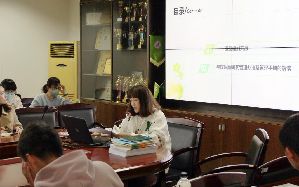 接下来,邢主任对学校的《课题研究管理办法》及《课题研究管理手册》进行了详细的解读。从开展部门、协同管理、组织进行、管理内容等多个角度出发,为课题组能够在今后研究过程中做到扎实有效、研究方法具有科学性与可操作性、研究体系完备等方面进行助力。