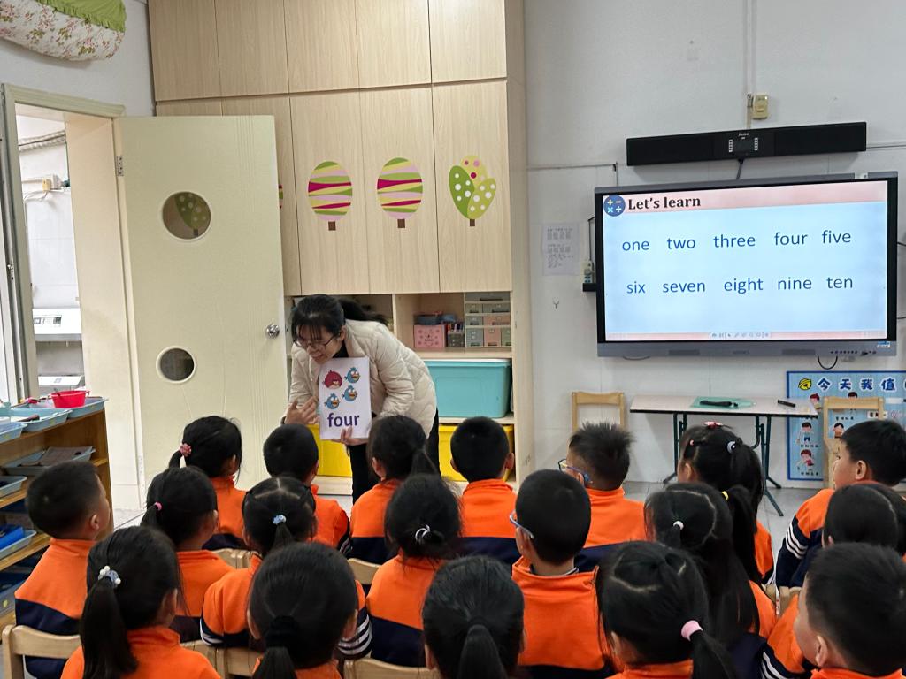 吴保平老师通过欢快的英文数字歌和有趣的数字卡片让孩子们走进有趣的英文数字王国,通过做动作、学口令、韵律歌、手指操等活动让孩子们初步感知数字的英文知识。整节课气氛活跃,孩子们在玩中学、学中玩,课堂参与度较高,师生互动较多,学习气氛热烈。