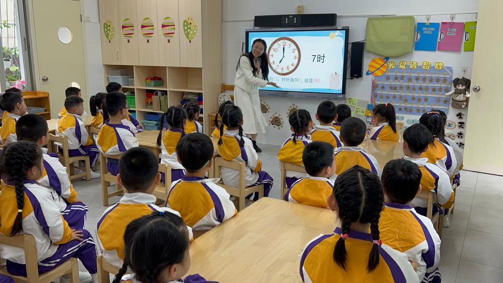 洪小翠老师执教的《认识钟表》,从学生已有的生活经验出发,以校园生活的一天为故事主线,利用真实、具体的生活情景认识钟表,让爱绿幼儿园大三班的小朋友们对数学产生浓厚的兴趣,并潜移默化帮助学生建立良好的时间观念。