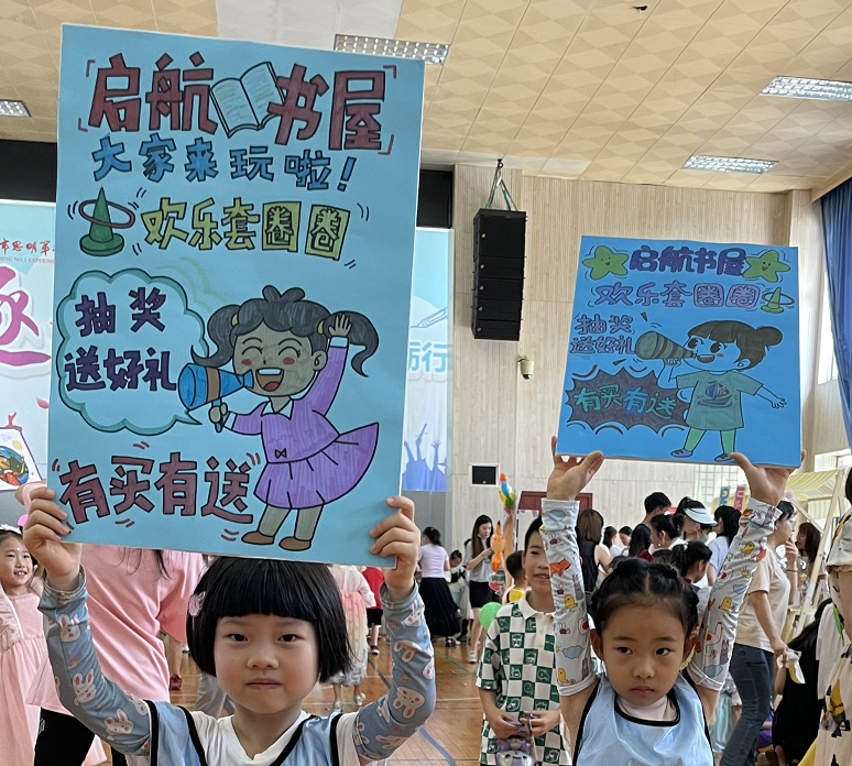 活动开始前,各个班级做了充足的准备:别具一格的海报、设计新颖的广告牌、不同主题的气球柱、吸引小顾客的小玩意儿等。摊位上摆满了趣味绘本、中外童话书、故事书、寓言书......真是琳琅满目,令人眼花缭乱。“启航书屋”“萌草书屋吧”“开心麻6铺”......瞧,各班精心制作的独一无二的宣传,是不是创意无限,美炸了你的心呢!