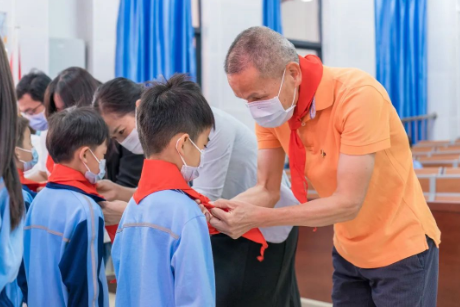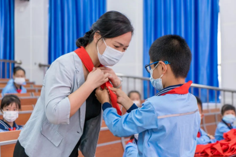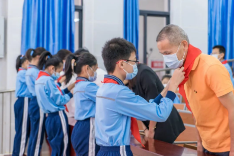 佩戴过程整齐有序,这是星星火炬交接的时刻,更是红色精神的传递。新老队员互相敬队礼,鲜艳的红领巾挂在胸前,自豪感和幸福感涌动心中。